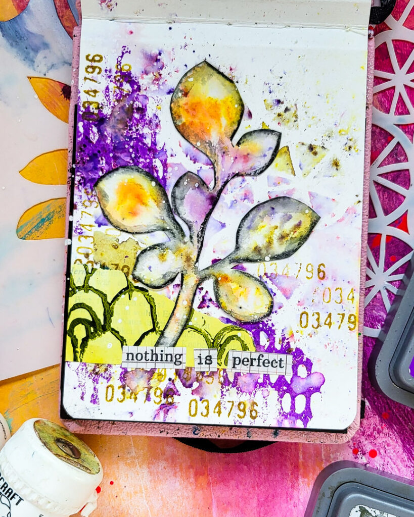 I started this spread by creating some texture by spraying water through the Wheels stencil onto the background and immediately sprinkling Brusho pigment poweder into it. That creates an interesting background. I used the same technique to make the focal point using the Sketchy Leaves 6 stencil.