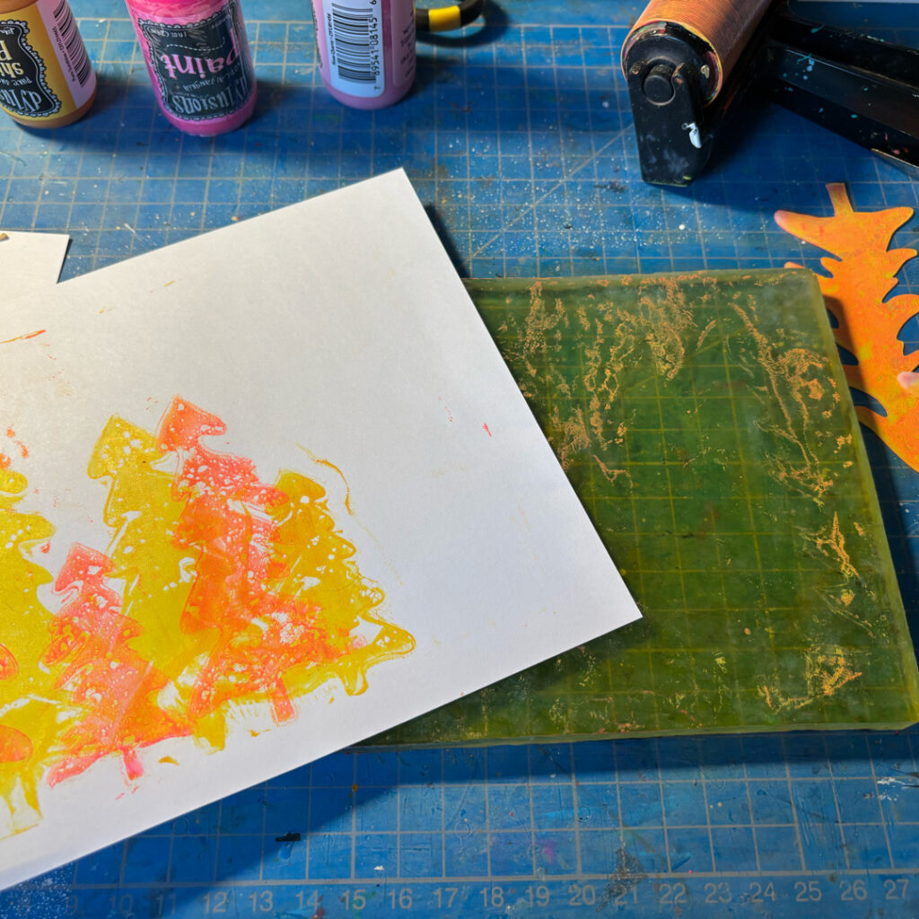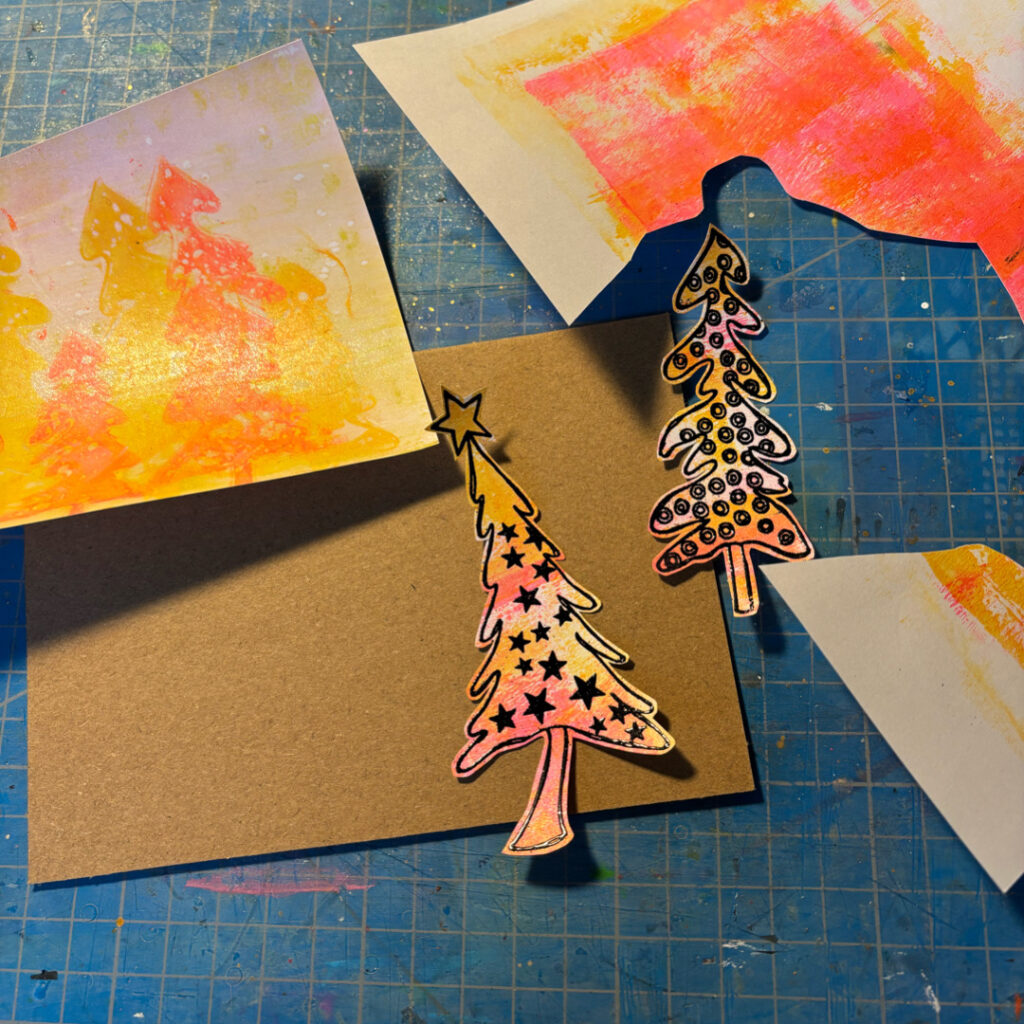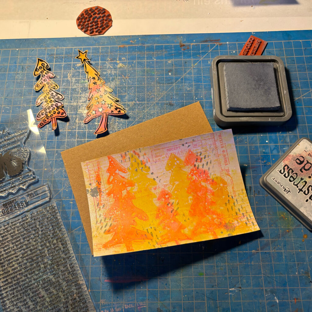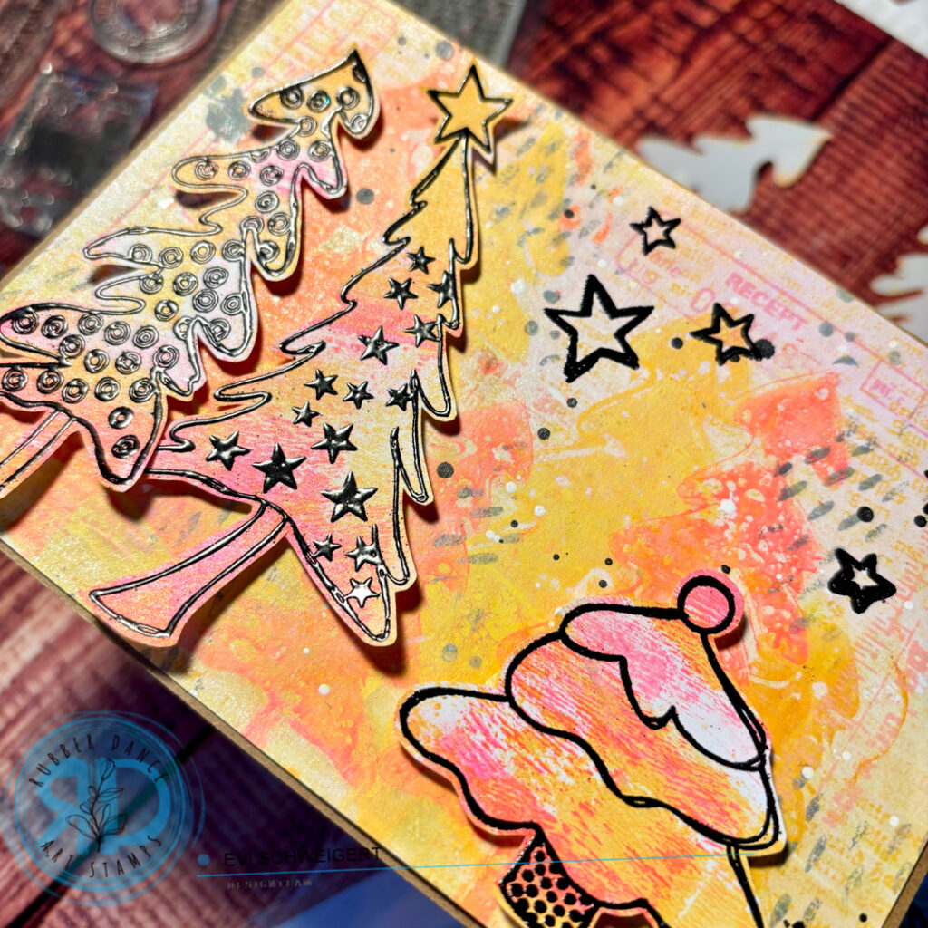 Hey there, its Evi on the Blog today with a tutorial for a mixed media card with a gelliplate background with XMas Trees stencil and Textured XMas Trees 2 stamps.