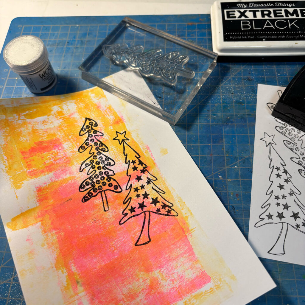 Mixed media card tutorial with Textured XMas trees 2 and Xmas Trees Stencil