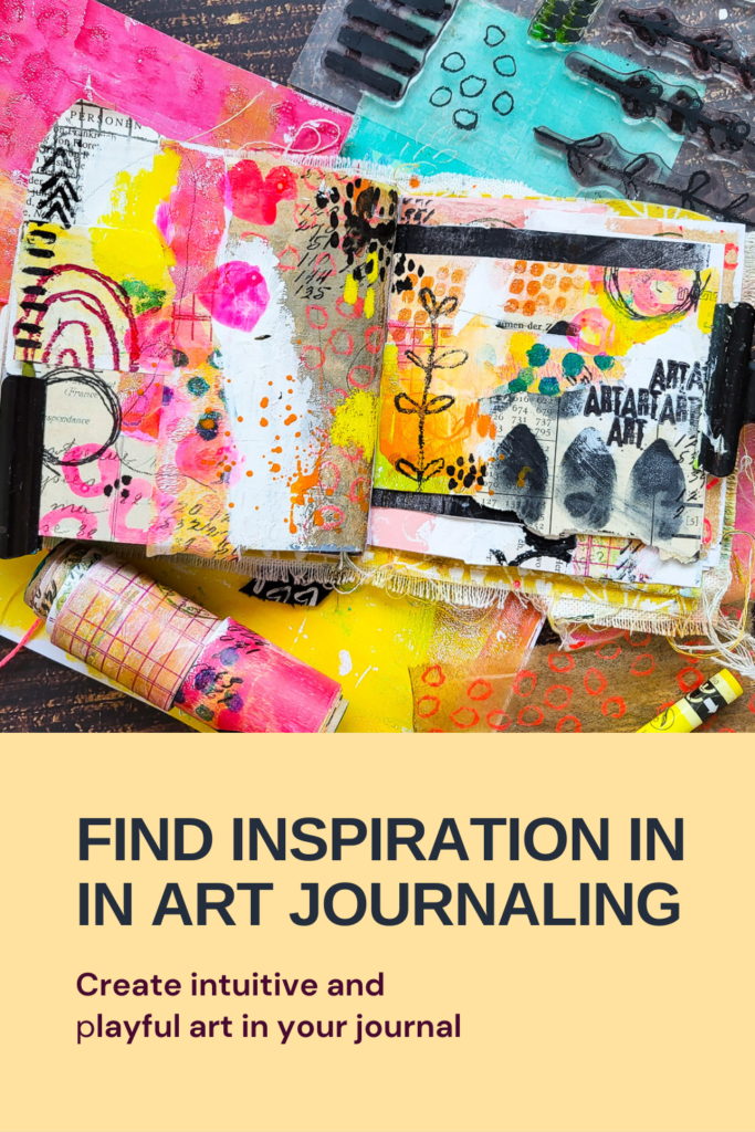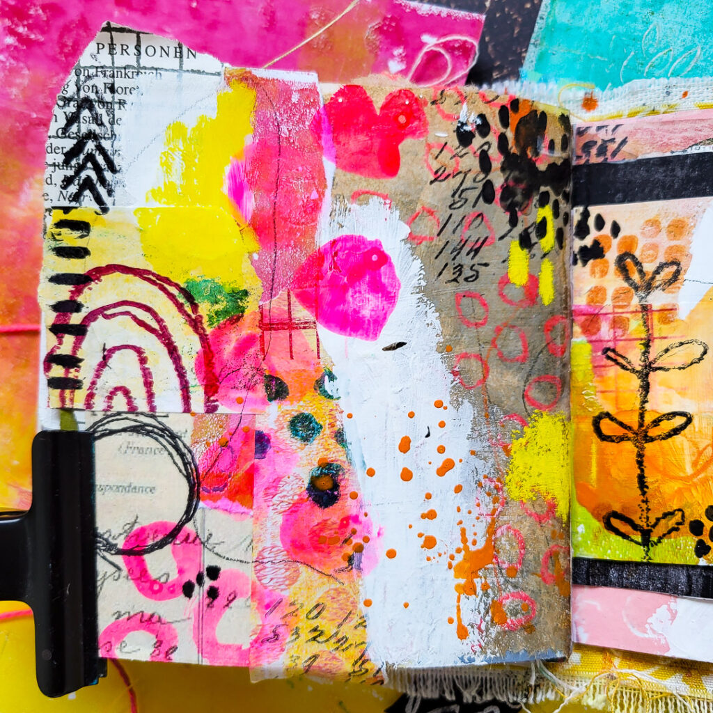 Hi there, Susanne here with a mixed media spread in my handmade junk art journal using stamps from our Pencil Marks 1 stamp set. I combined it with a background collage, gesso and mark making with Neocolors. This little journal is perfect to experiment and play! I will link up a tutorial on how to make your own at the end of this post.