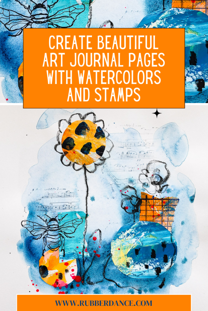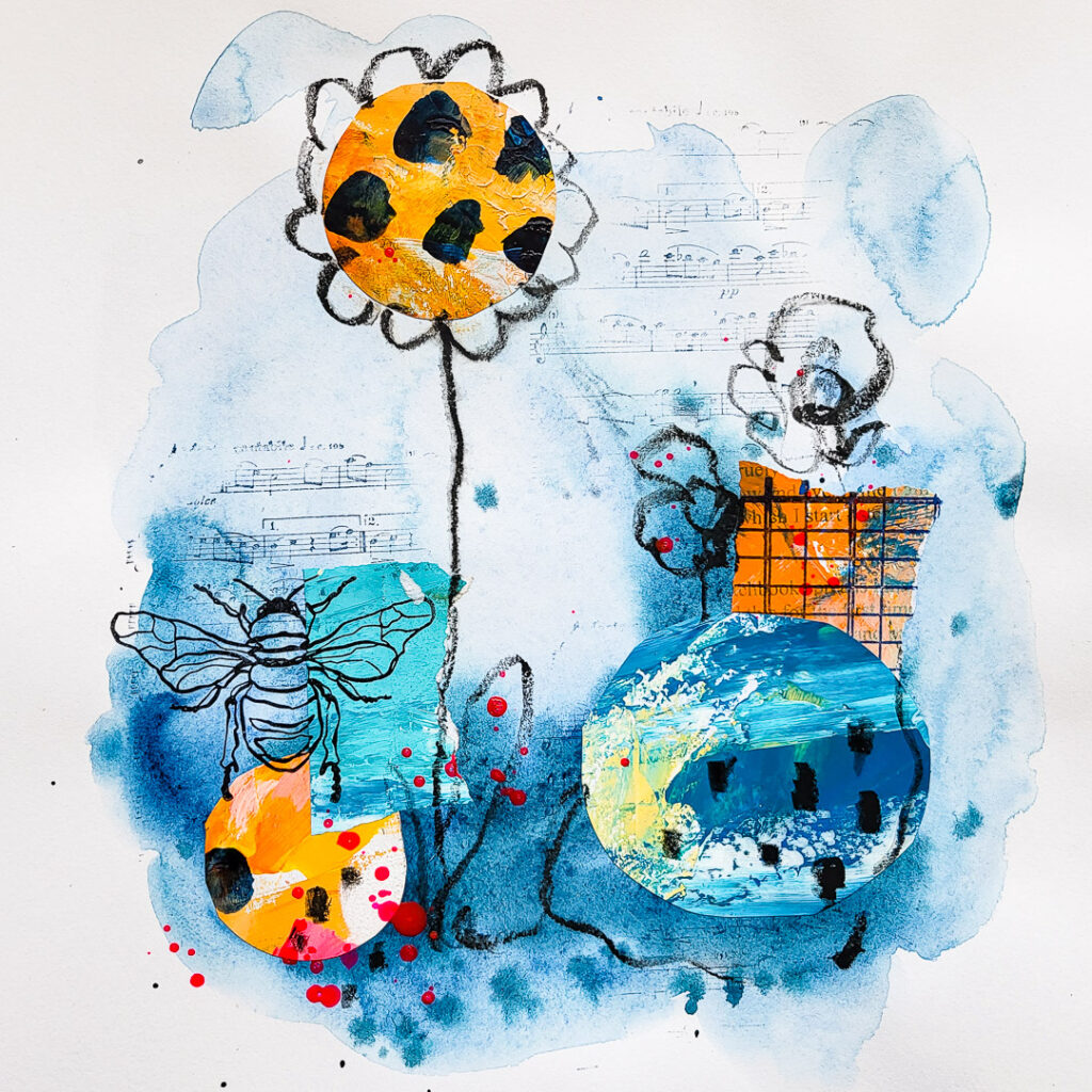 I lay down some watercolors loosely in blue shades, a lighter and a darker one. I made some splatters with the darker blue at the bottom of the page. Once this was dry I used our lovely Music background to add some textured. I then cut out some shapes from collage papers. I used some “left over paint papers”. I adhered the elements to the page. I added some mark making and scribbles with a black watercolor pencil. The bumble bee was directly stamped to the background. I stamped it a second time to a collage piece and then adhered part of it on top.