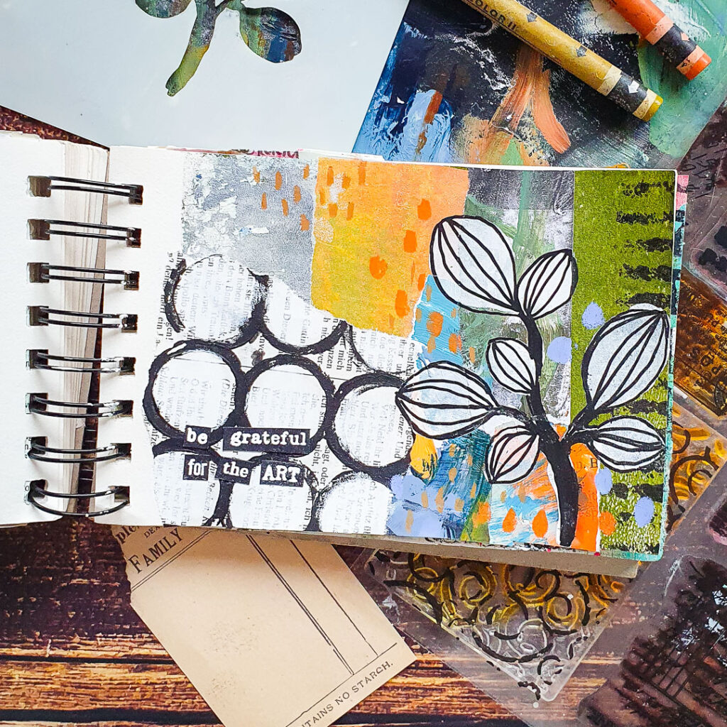 After I had adhered all the collage papers, I added a little bit of markmaking with Neocolors and stamped a border to the right side of the page. I then stenciled the botanical through the Sketchy Leaves 1 stencil with white acrylc paint using a make up sponge. I used a black posca marker to add in some vains. The title is made with words from our Mix A Sentiment stamp set.