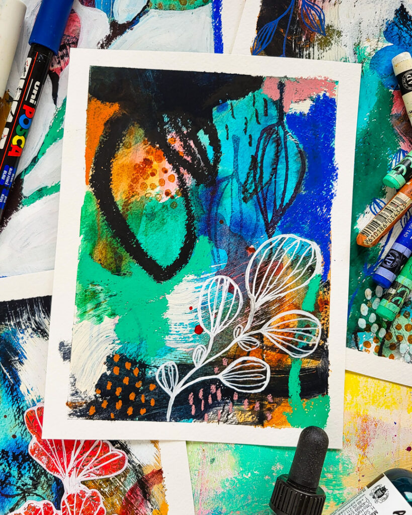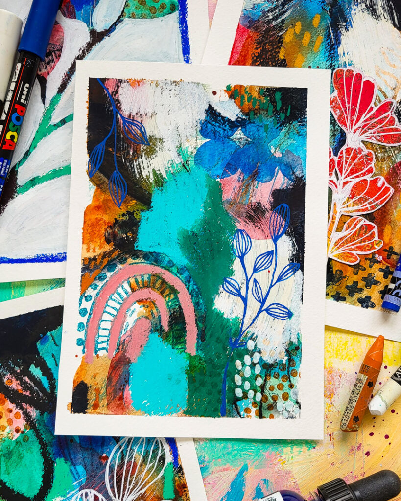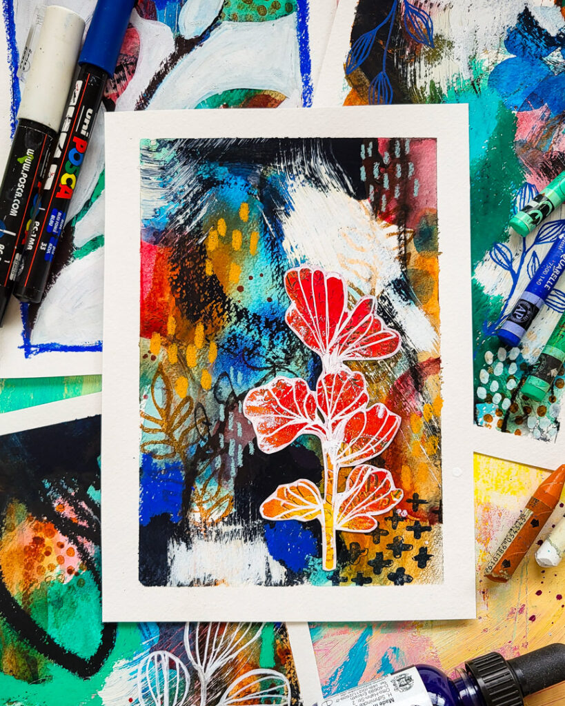 Hi there, Susanne here with an abstract mixed media painting tutorial using all kinds of materials together with stamps from Pencil Marks 8 and a focal image made with our Sketchy Leaves 5.