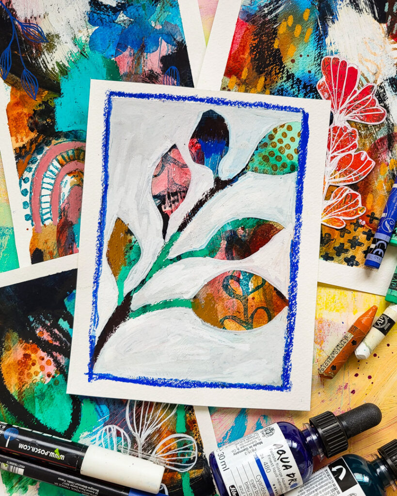 The background of this abstract painting was done with a fun intuitive process. I used a big sheet of watercolor paper and created four panels with masking tape on it. I then applied all kinds of materials – stamping, liquid watercolors, watercolor pencils, crayons… Once I removed the tape I had left four abstract backgrounds to work on.