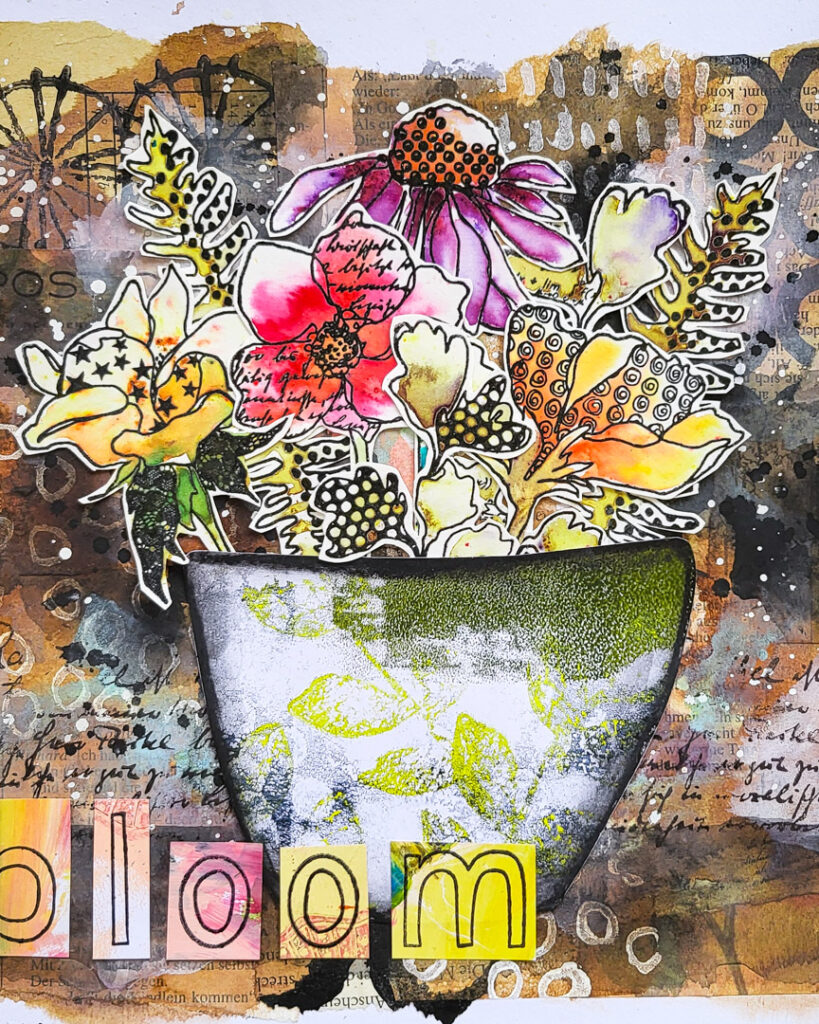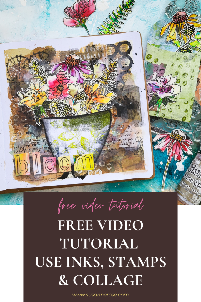 Hi there, Susanne here sharing a mixed media art journal page with collage and a big variety of materials. The focal image is a flower bouquet made with stamps from our Doodle Flowers 2 set. Scroll down for a full process video.