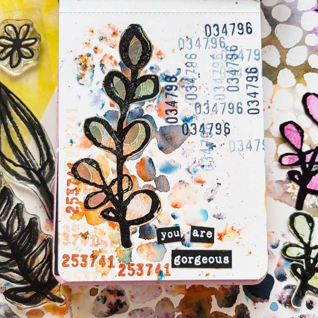 For this spread I was working in my mini watercolor journal. I spritzed some water through our Organic 4 stencil onto the background and sprinkled Brushos (Black and Sandstone) over the top immediately. This gave me a wonderful and interesting texture. Once that was dry I added some texture by stamping the numbers from Mix It Up 7 in dark blue and orange – to match the Brushos I used.