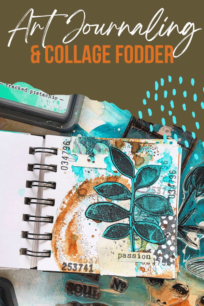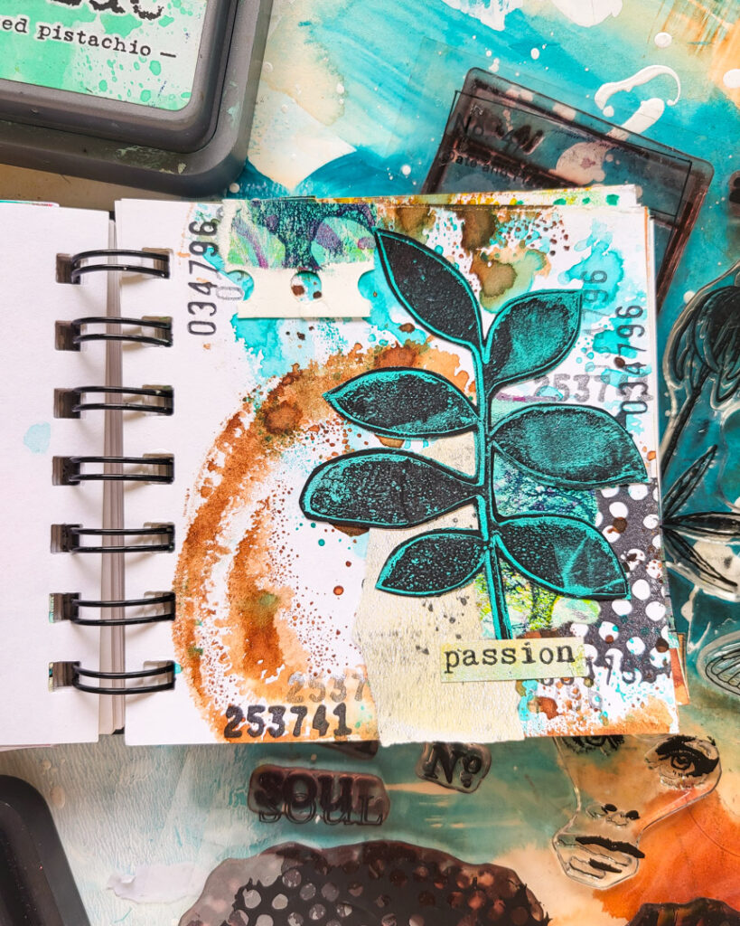 Hi there, Susanne here sharing a mixed media art journal page in my mini journal using Distress Inks for the background combined with collage papers made with the gelli plate. The focal image is a fodder piece made with our Sketchy Leaves 6 stencil.