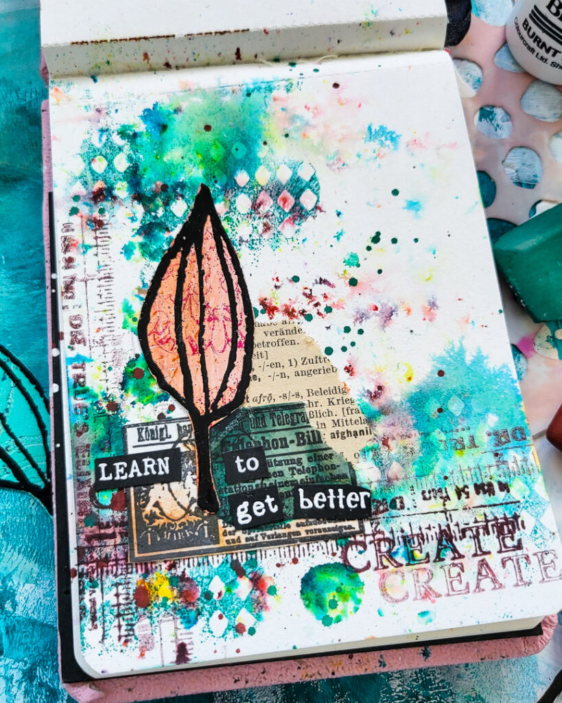 Once the background was dry I adhered a few bits of collage paper bits and my focal image – a leaf from Pencil Marks 8 embossed on a gelli print background. I finished the little spread making a title with words from our Mix A Sentiment stamp set.