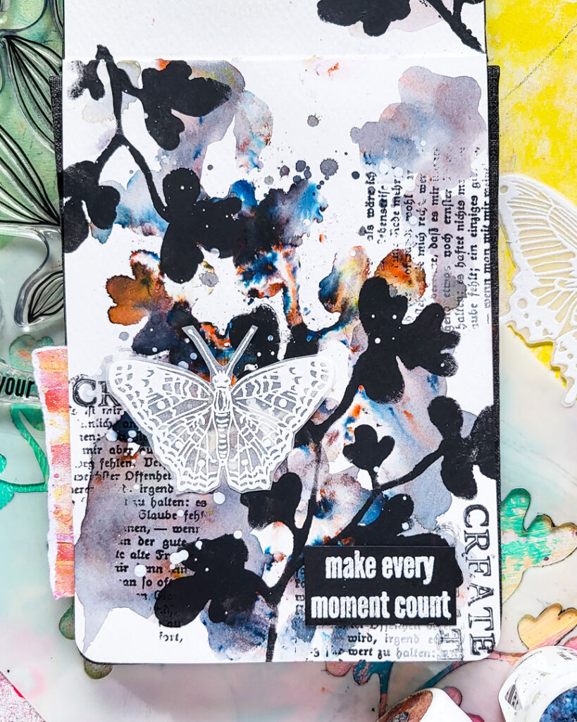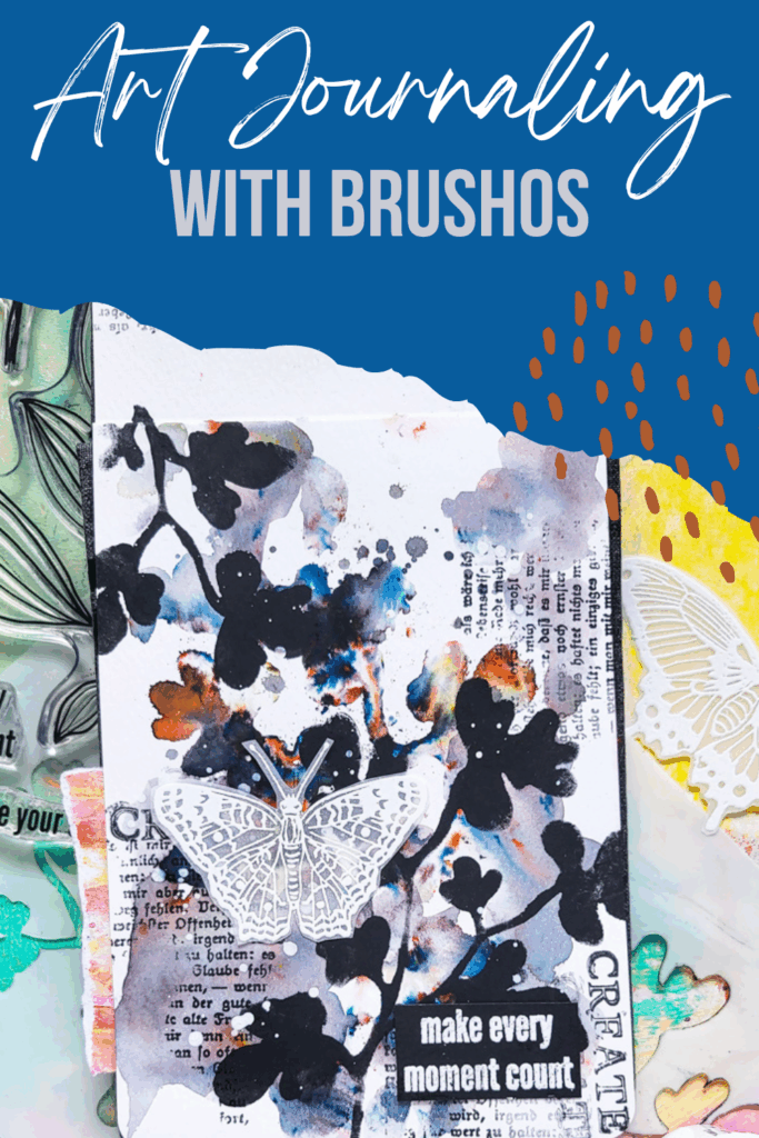 Hi there, Susanne here sharing a super easy art journal page using Brushos together with our Sketchy Leaves 7 stencil. I also use some stamps from Mix It Up 5 and Butterflies and Moths.