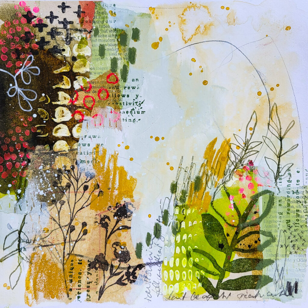 Hi there, Susanne here sharing an abstract art journaling process using handmade collage papers together with different materials and mark making. For my collage papers I used stamps from Pencil Marks 8 and Weed Love 2025.