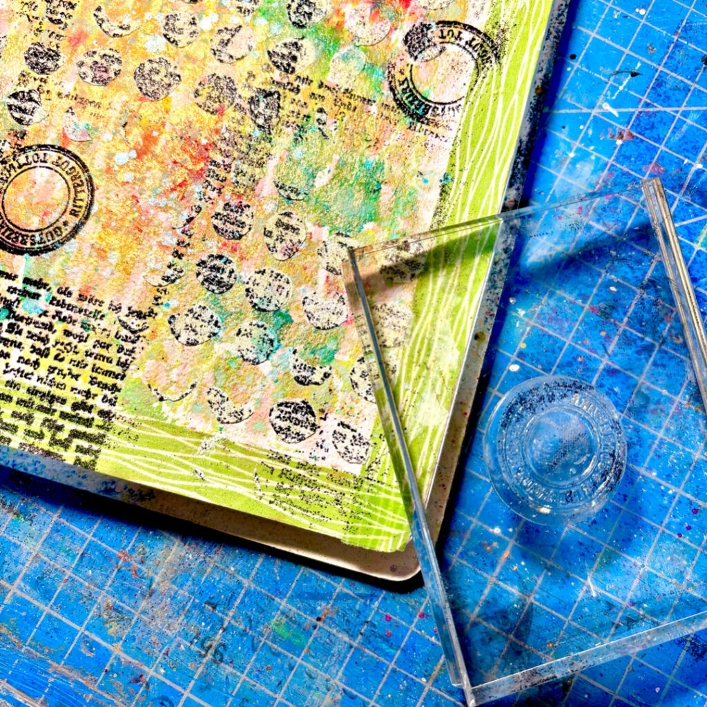 I applied some textured paste over the Stencil Dotted and stamped two text stamps in various places.