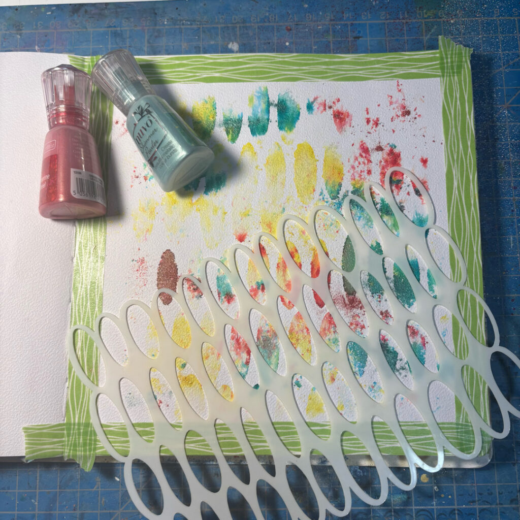 First, I placed the stencil Stacked ovals on top, sprayed it with water, and then sprinkled the shimmer powder over it.
