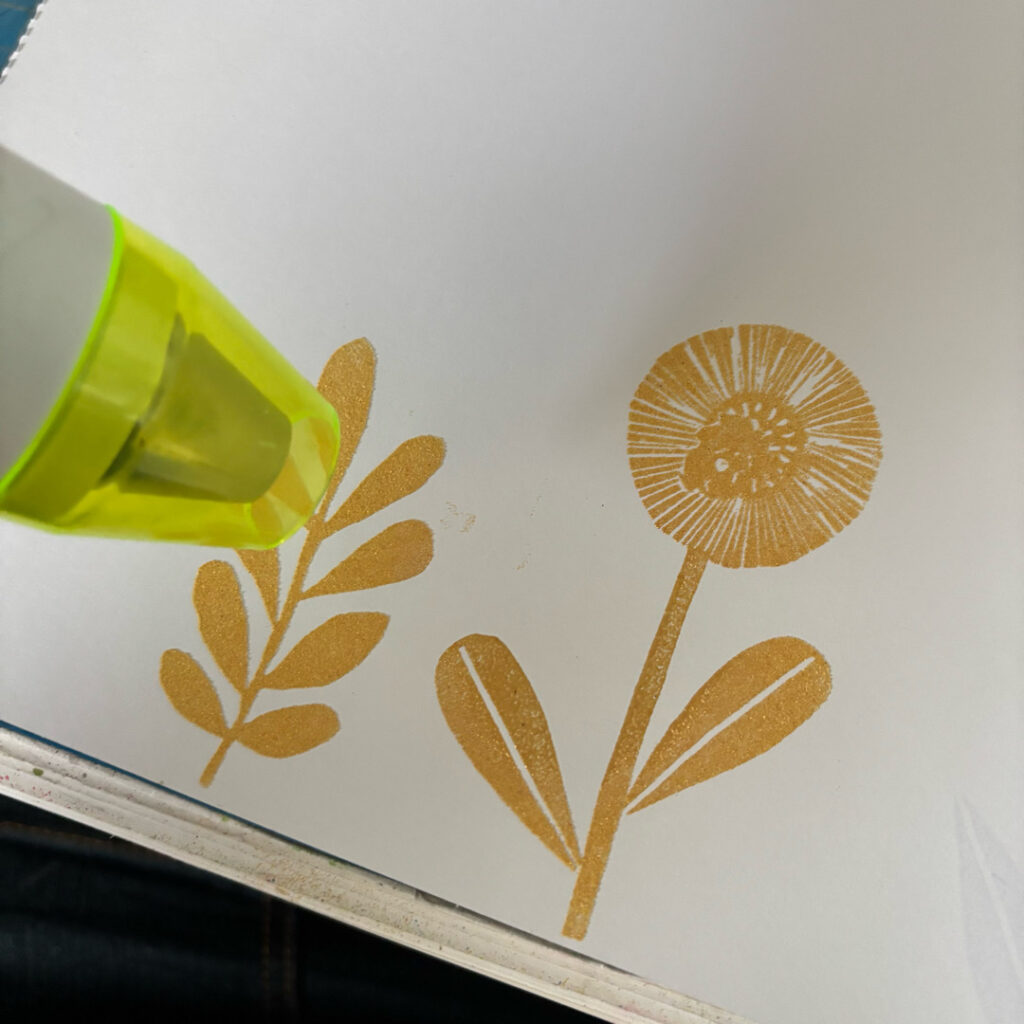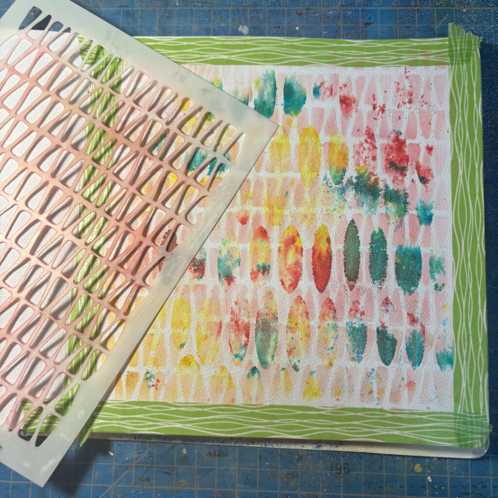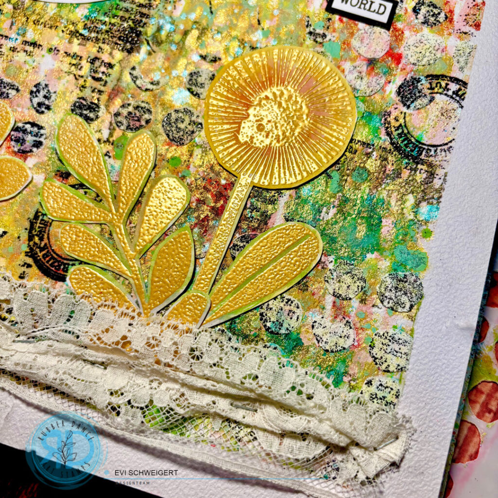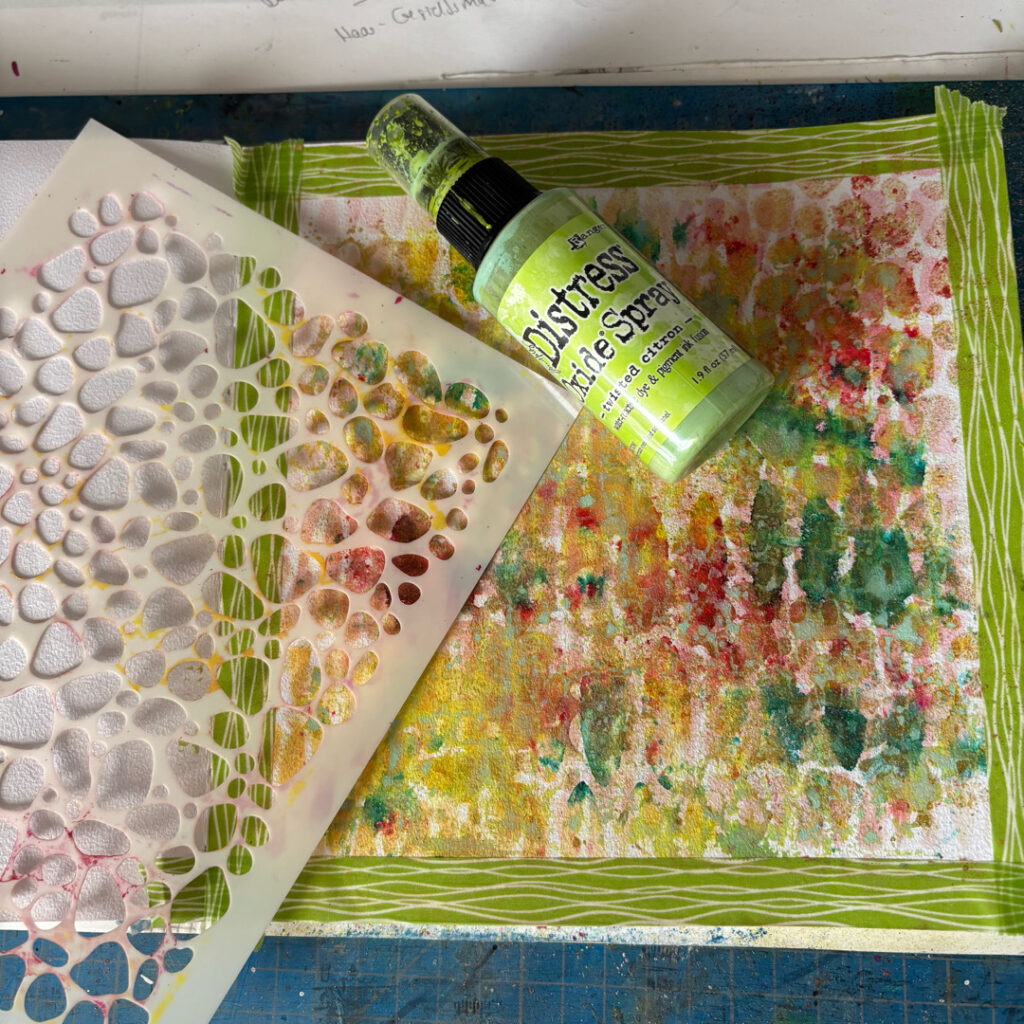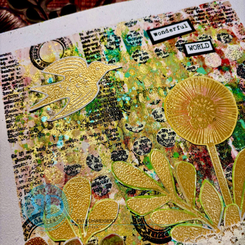 As a third step, I placed the stencil Organic 4 on top and sprayed it with gold and light green spray paint.