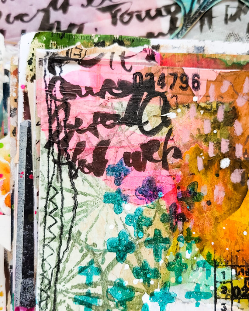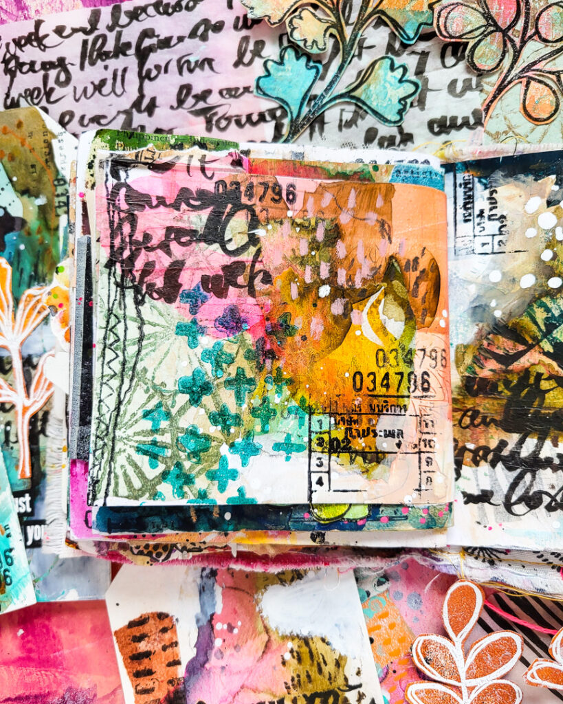 I am working in my handmade journal today. There is a video linked at the end of this post on how I made this. I am starting by adhering different collage papers with gel medium to the pages. The papers are all handmade and contain gelli printed rice paper, painted tissue paper and newsprint paper. I use acrylic inks to add colour and some background stamps from Mix It Up 7, Pencil Marks 8 and Stitching Borders to make some marks.