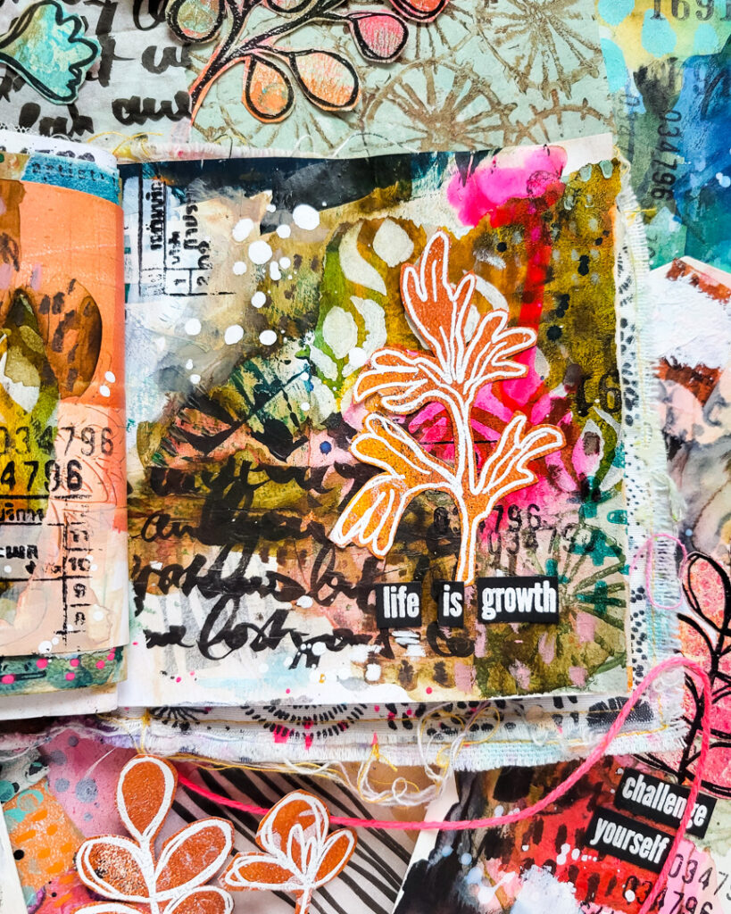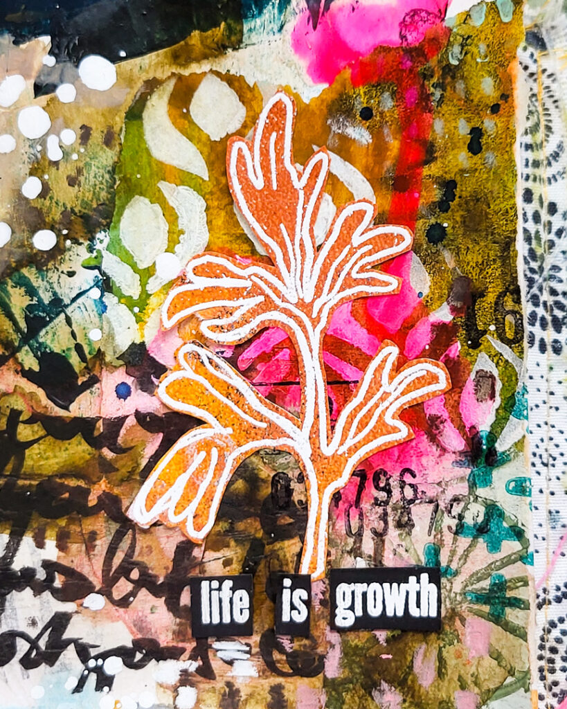 As a focal image I used a stamp from our Collage Leaves 3 set. It is embossed in white on a gelli print.