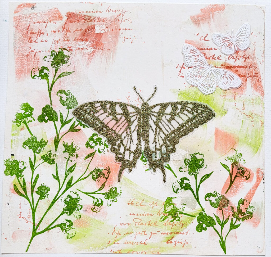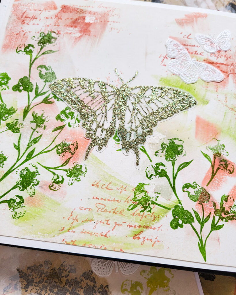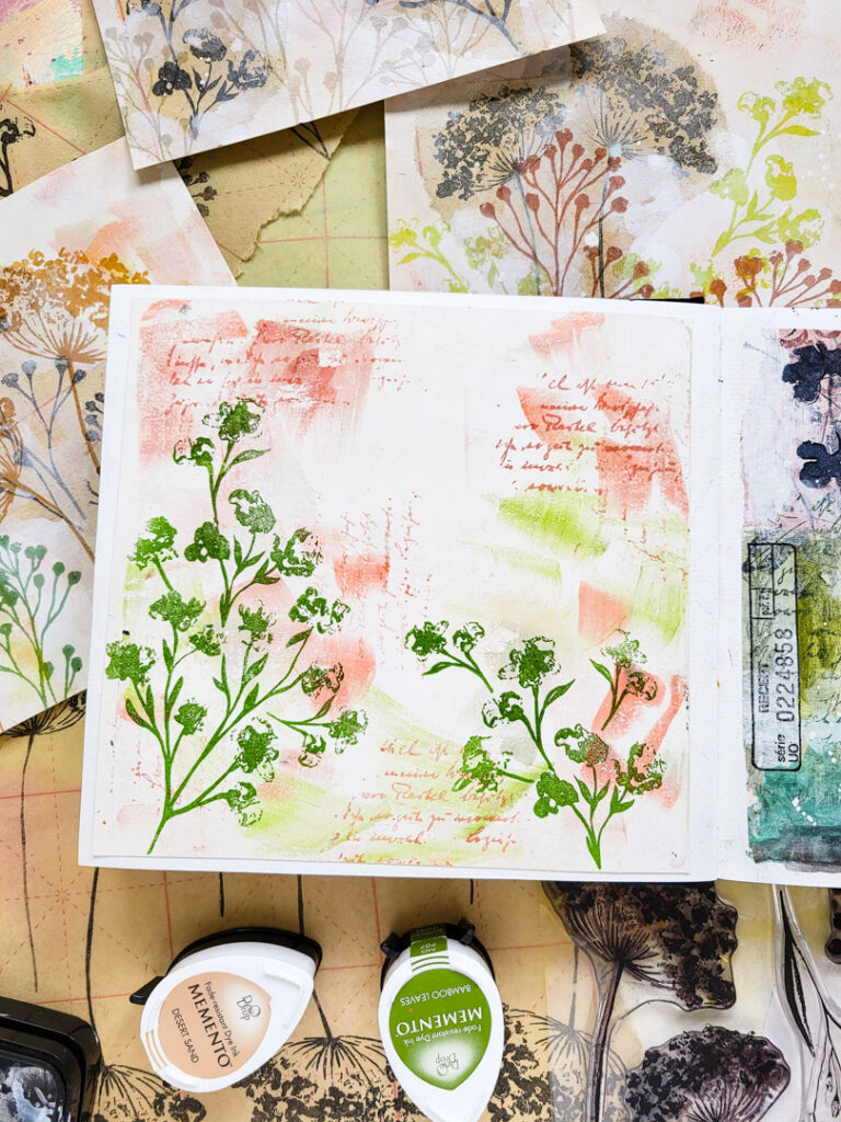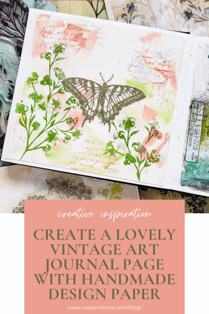 Hi there, Susanne here with a vintage art journal spread using one of the vintage design papers I shared last time in this post. On this spread I used stamps from Weed Love 2025 and Butterflies & Moths.