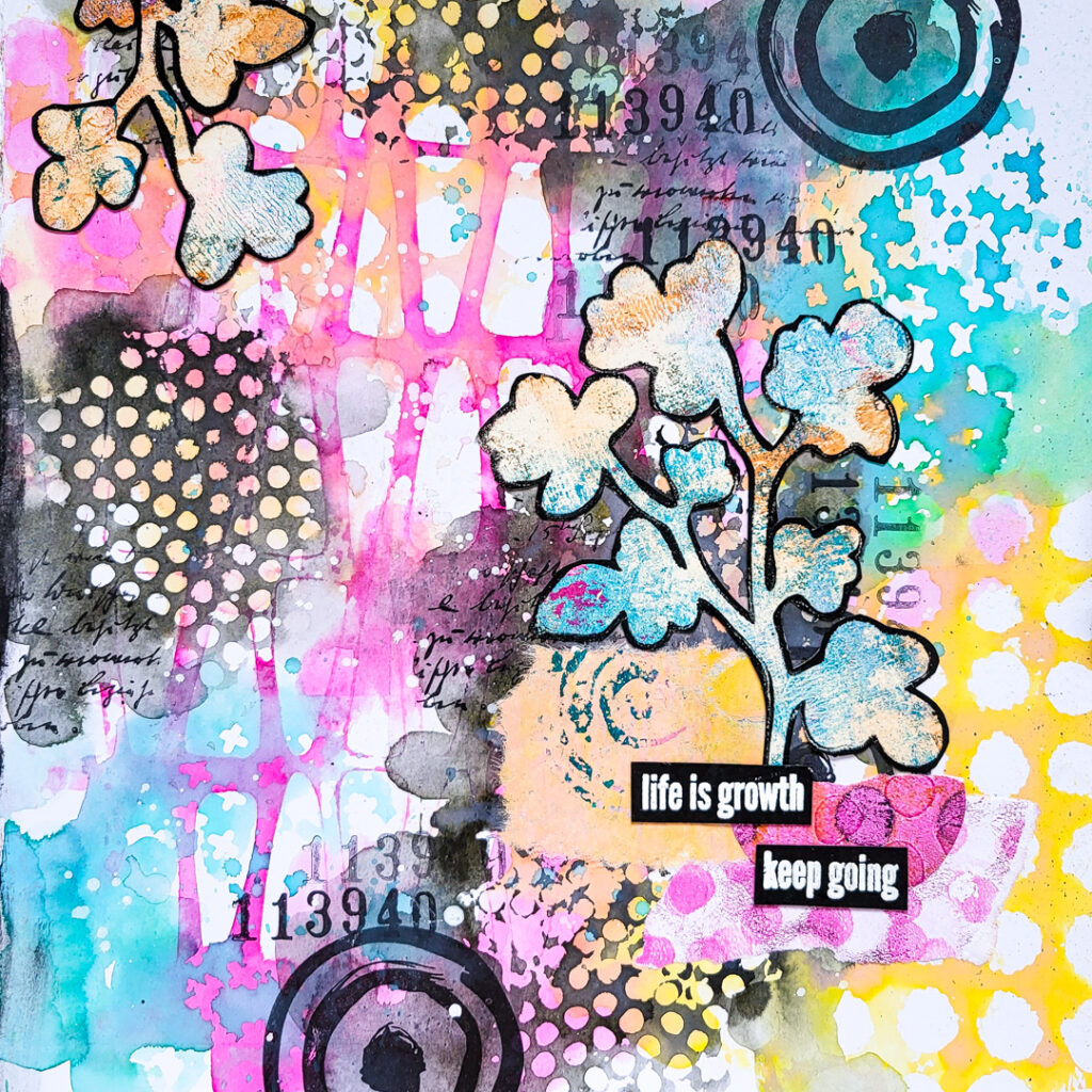 Once that is all dry I add a bit of stamping with images from Mix It Up 4 and Mix It Up 6. I also make some white splatters.