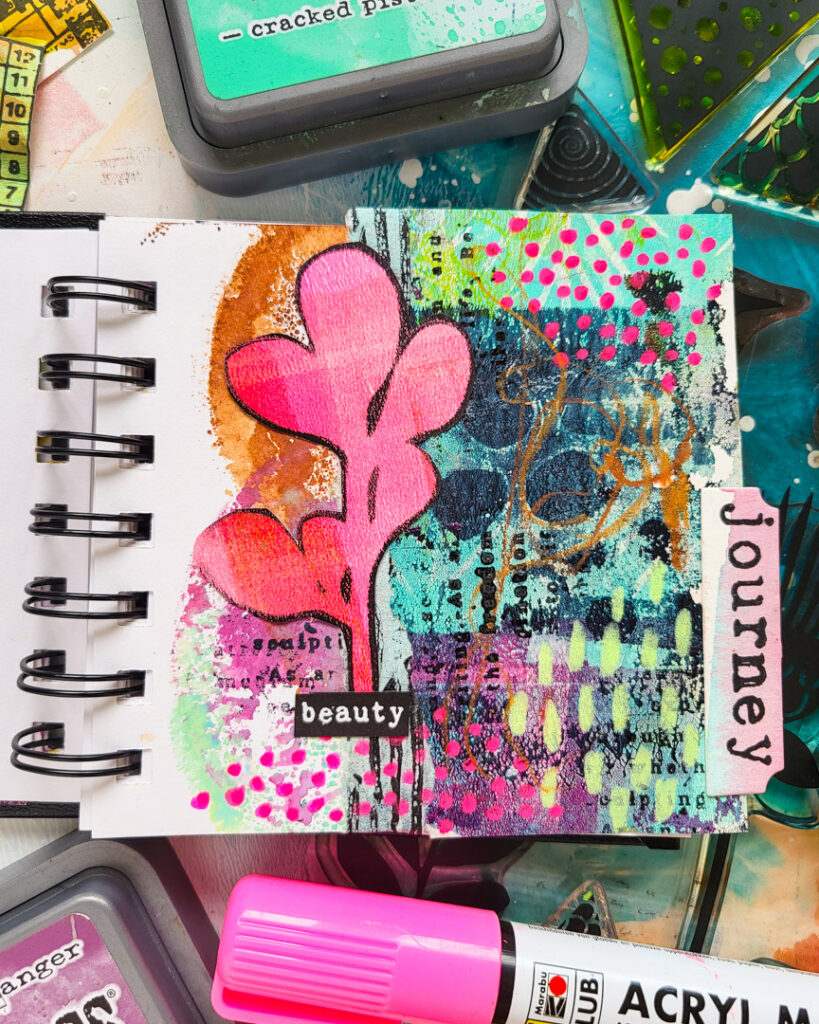 Hi there, Susanne here sharing a mixed media art journal page in my mini journal using Distress Inks for the background combined with collage papers made with the gelli plate, stamps from Mix It Up 4 and a botanical focal point made with Sketchy Leaves 6.