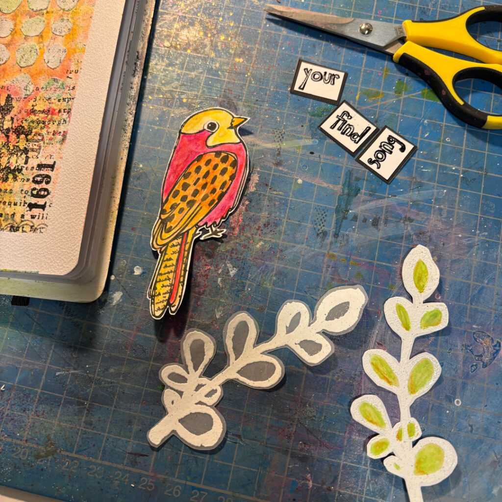I designed my art journal today to match spring. In friendly colours and with a bird, as they can be heard everywhere at the moment.