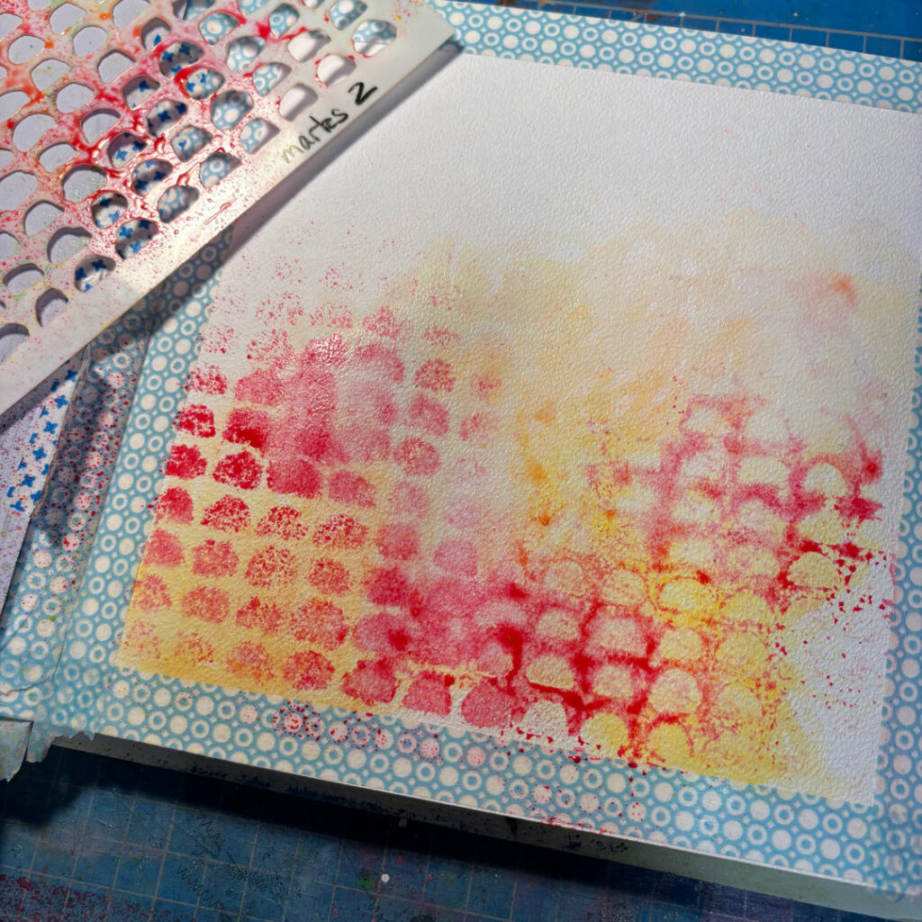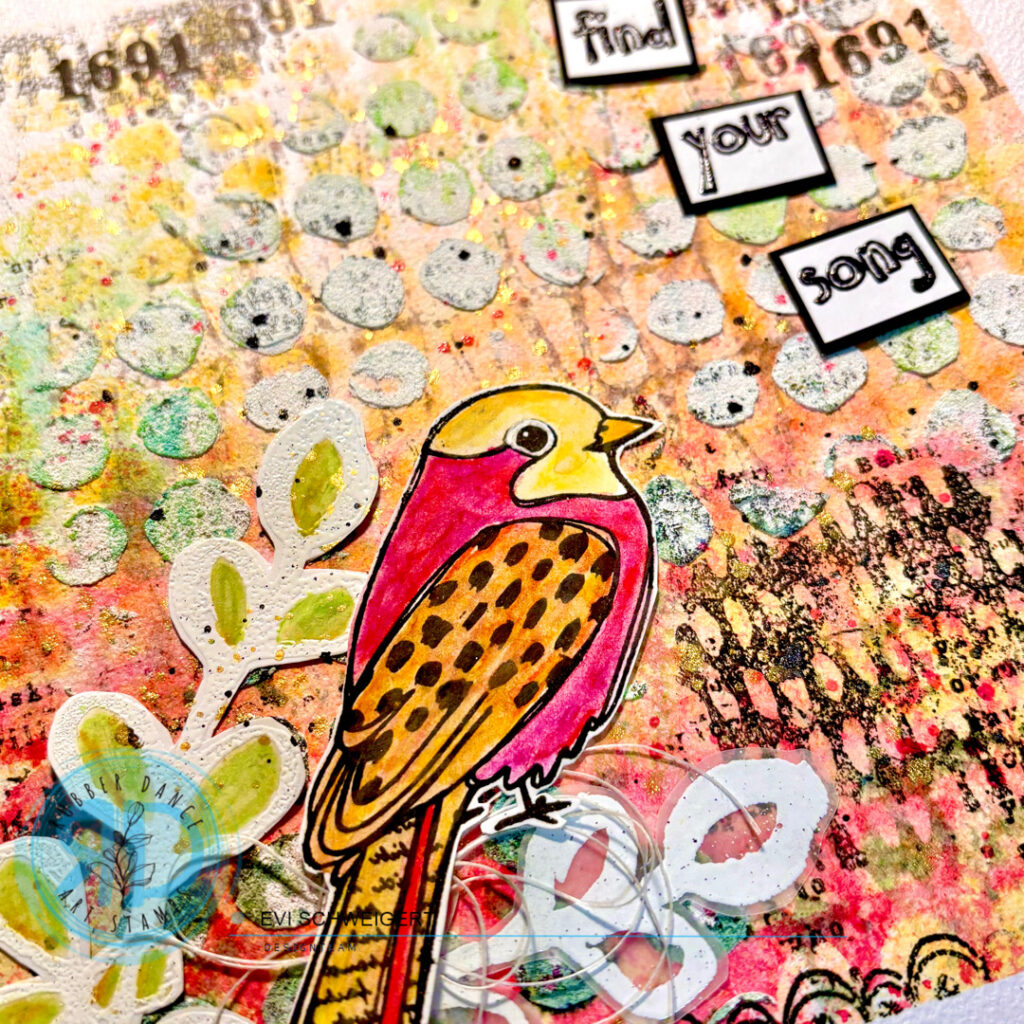 Hey there, it’s Evi on the Blog today sharing a tutorial of a mixed media art journal page with a Distress Ink background, texture paste and different stencils. The main focus is on the bird on the branch, for which I used the stamp sets Textured Birds 2 and Pencil Marks 8.