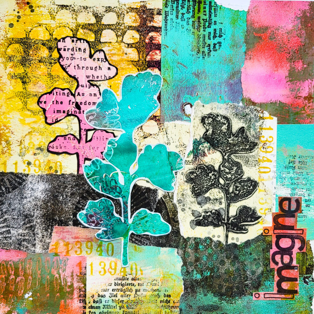 For my focal images I picked two botanical collage fodder pieces that I’ve made with our Sketchy Leaves 5 stencil and the gelli plate. I will link a video tutorial for those at the end of this post.