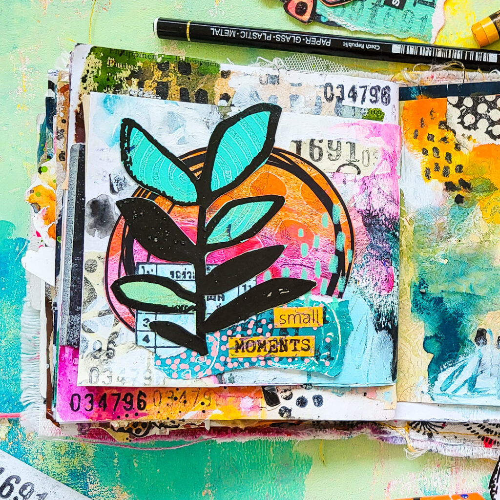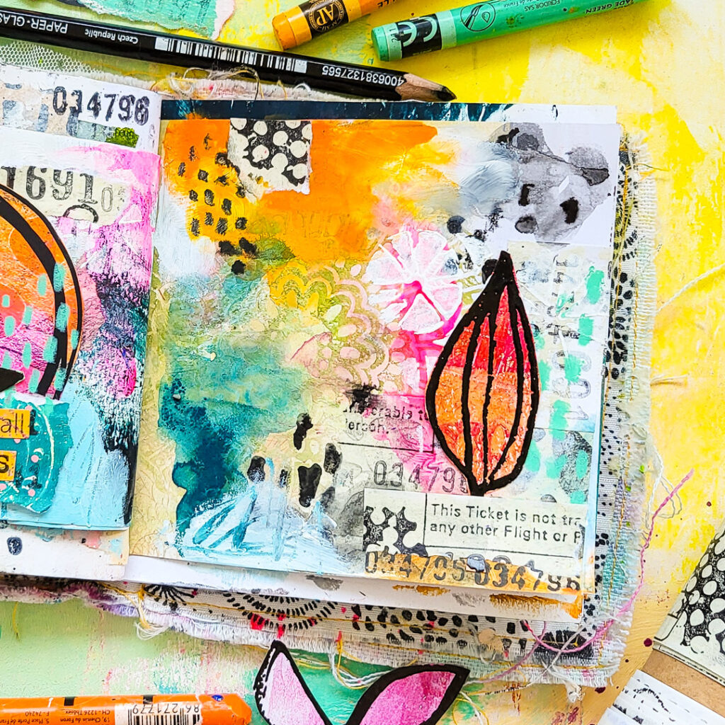 Hi there, Susanne here sharing a mixed media spread in my pocket junk art journal using mark making and collage fodder made with Pencil Marks 8. Scroll down for a video tutorial.