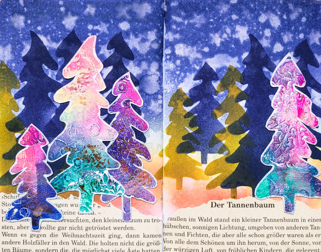 Once the page was dry, I added some stenciling using the XMas Trees stencil with Chipped Saphire and Distress Oxide in Peeled Paint. I adhered two strips of old book paper to the bottom of the page. By chance it was a page from a German Christmas book and had the title “Der Tannenbaum” on it.