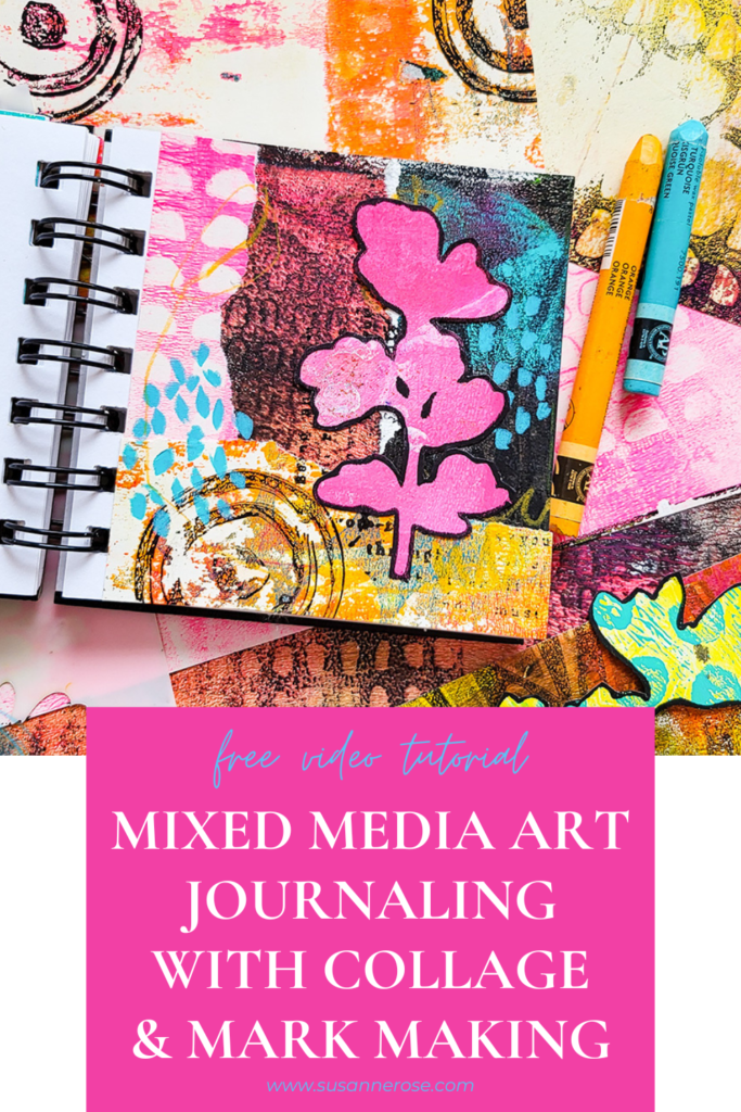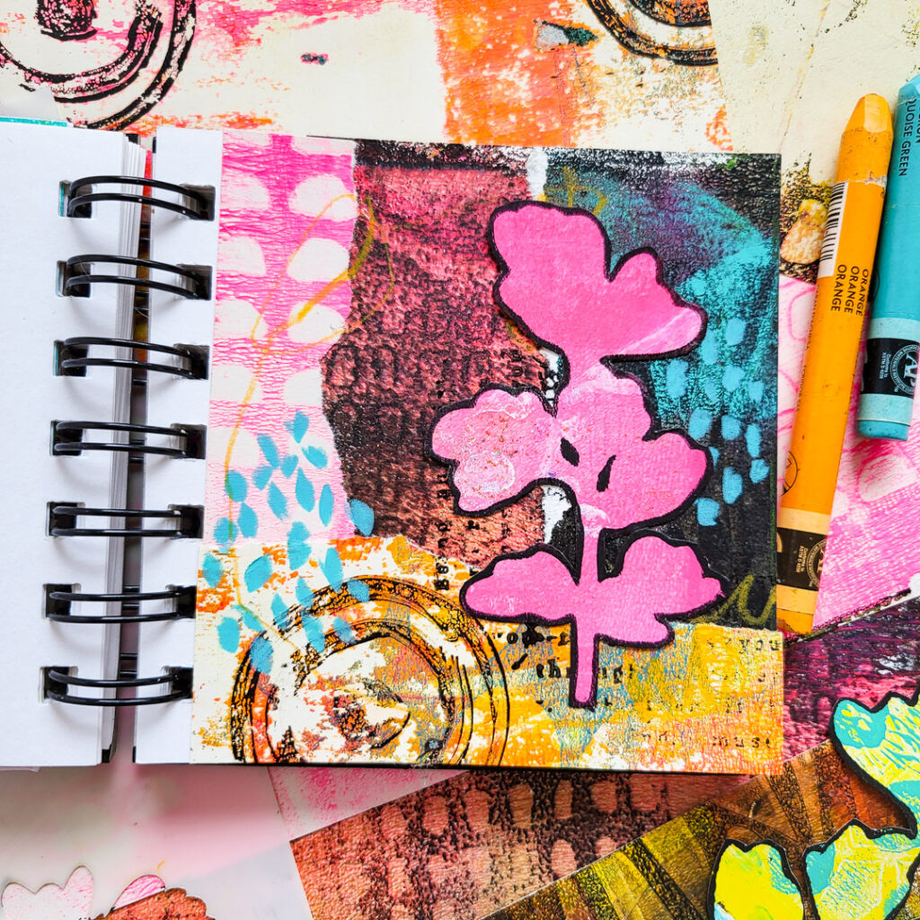 Hi there, Susanne here sharing a mixed media art journal collage in my mini journal using gelli prints and a leaf made with our Sketchy Leaves 5 stencil. Scroll down for a quick process video.