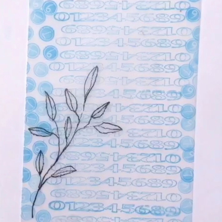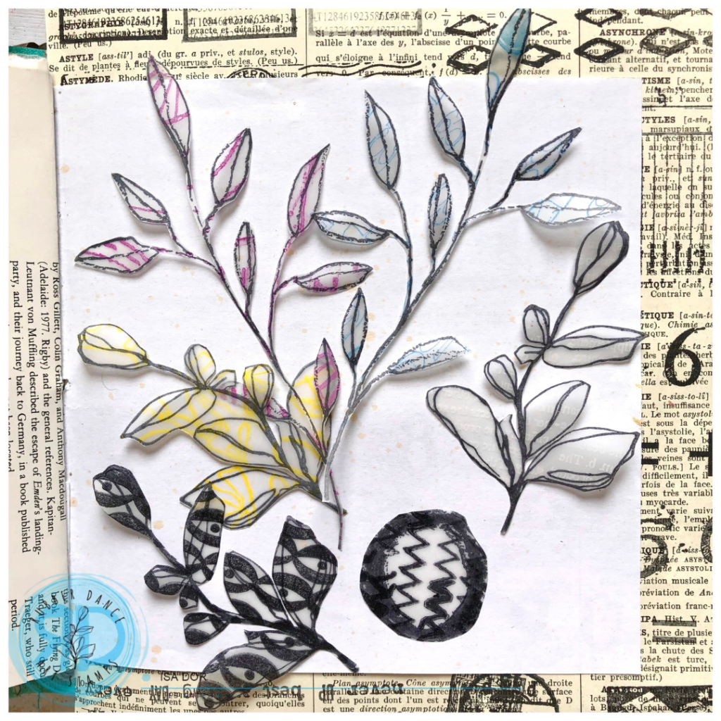 This time, I’m using colored permanent ink to stamp one same pattern on each of the tracing paper sheets.  Then I stamped an image (Pencil Marks 3, Sketchy Leaves) with black Stazon ink on three different sheets of tracing paper, and fussy cut them.