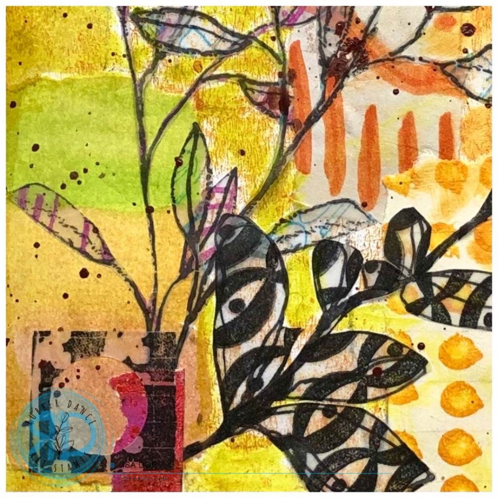I then arranged my 3 stamped images on tracing paper on this background, together with small pieces of papers coming from previous gel printing or doodling sessions.