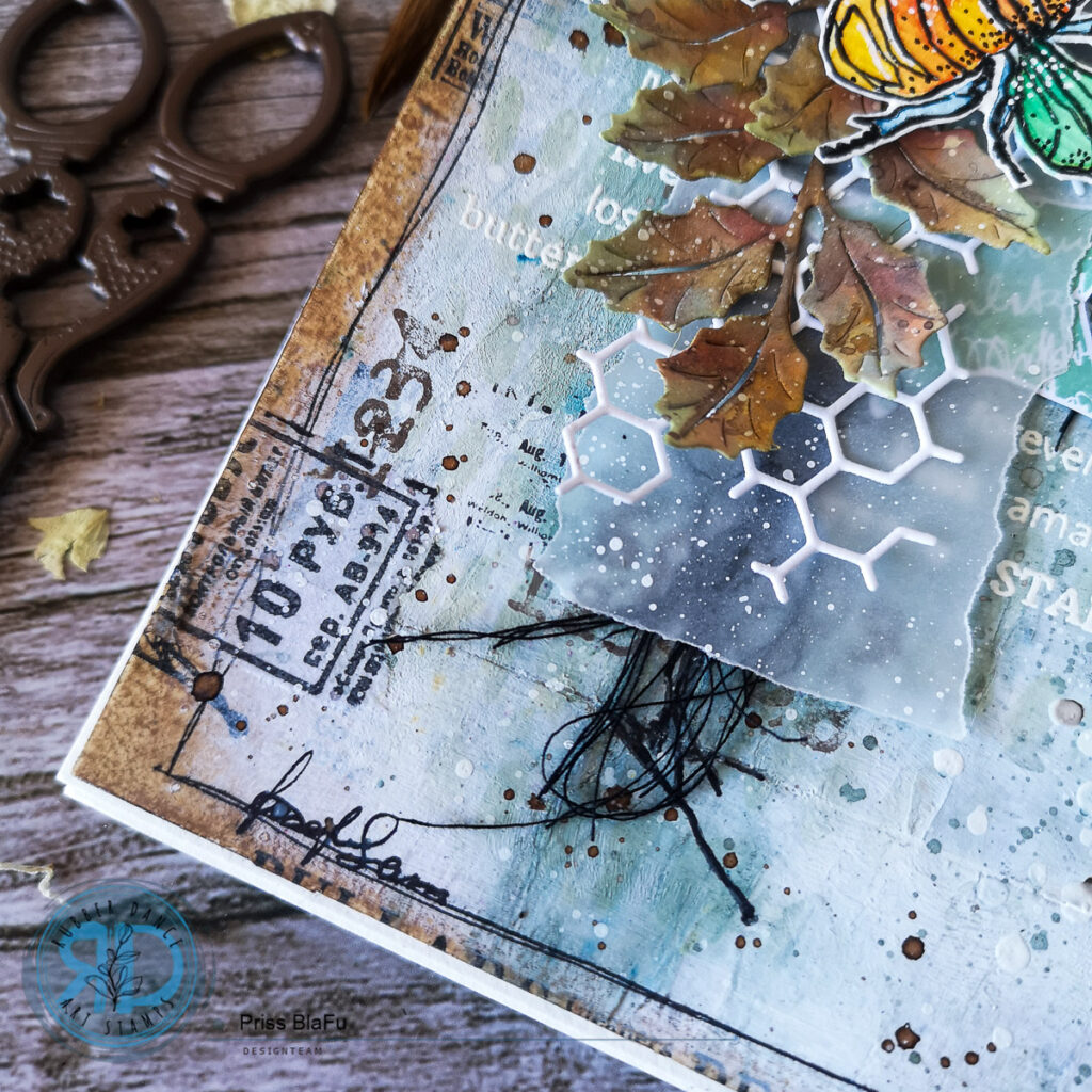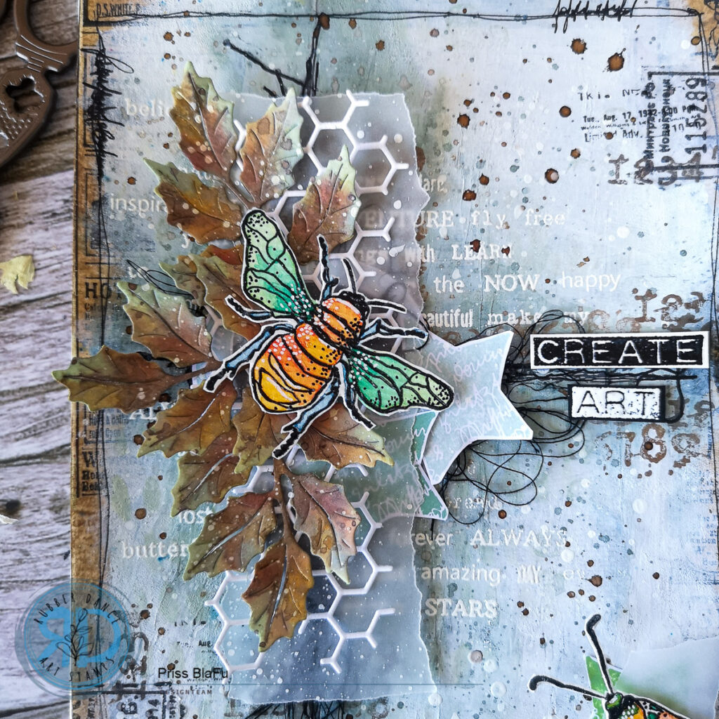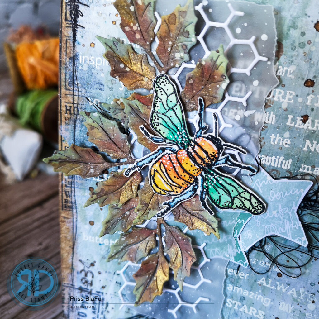Stars and circles from the Grungy Stuff set gently peek out from under the torn vellum, while on top I placed an intricate die cut of beehives. To highlight my beloved little bee even more, I added delicately painted leaves with colors that perfectly match the autumn theme.