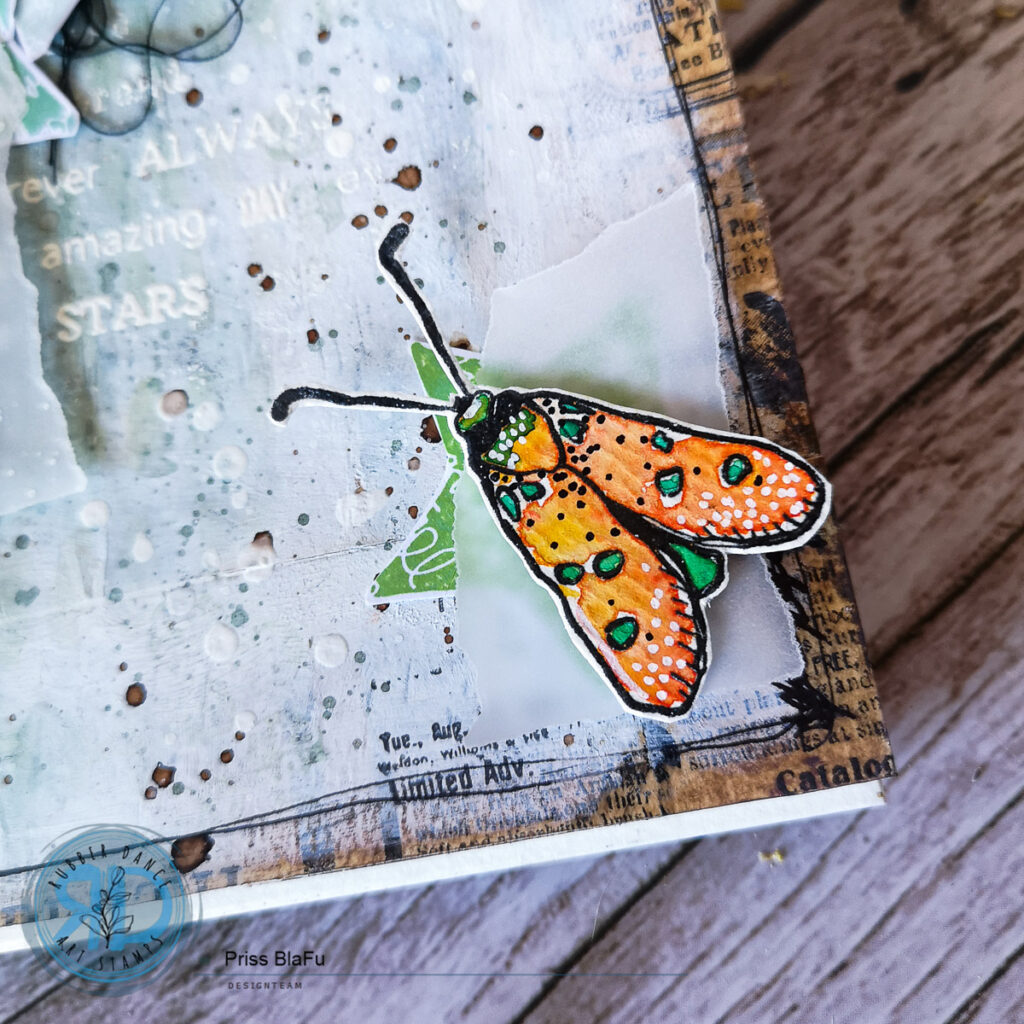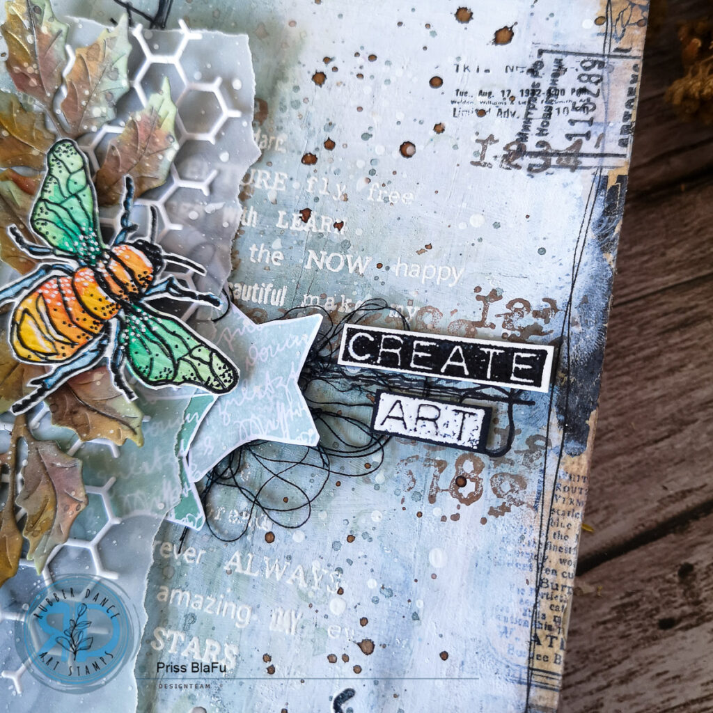 In closing, this journey into the world of stamps and mixed media in company of my Art Journal has been a delightful creative adventure. We have seen how a simple bee stamp can be transformed into a rich and captivating composition using different techniques and materials.