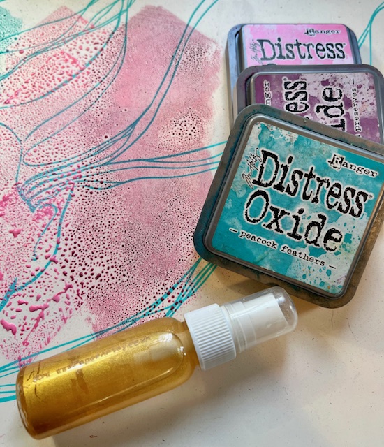 First I created some backgrounds using Distress Oxides. I swiped 3 colours on my craft mat, spritzed with some water that has a little bit of gold mica powder in it, which creates a little sparkle on the dry page. I swiped my white card through the colour and left to dry.