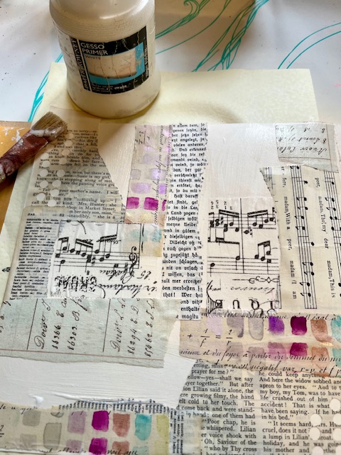 I then stamped a selection of feathers on these pages. In my journal I began by gluing some ephemera on the page using matte medium.
