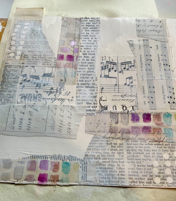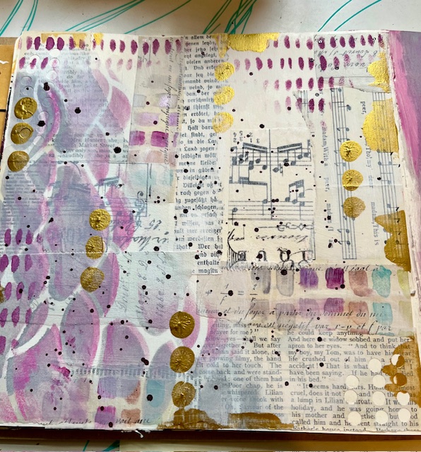 I used gold acrylic paint for more mark making and scraped some of it around the edges with an old credit card. I also added some magenta ink splatter.