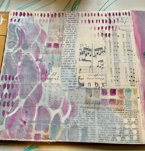 Once this was dry I covered the page in a light layer of gesso to make the background look more cohesive. I used similar colours to one of my Distress Oxide backgrounds and the Organic 3 stencil, as well as some mark making to add more interest.