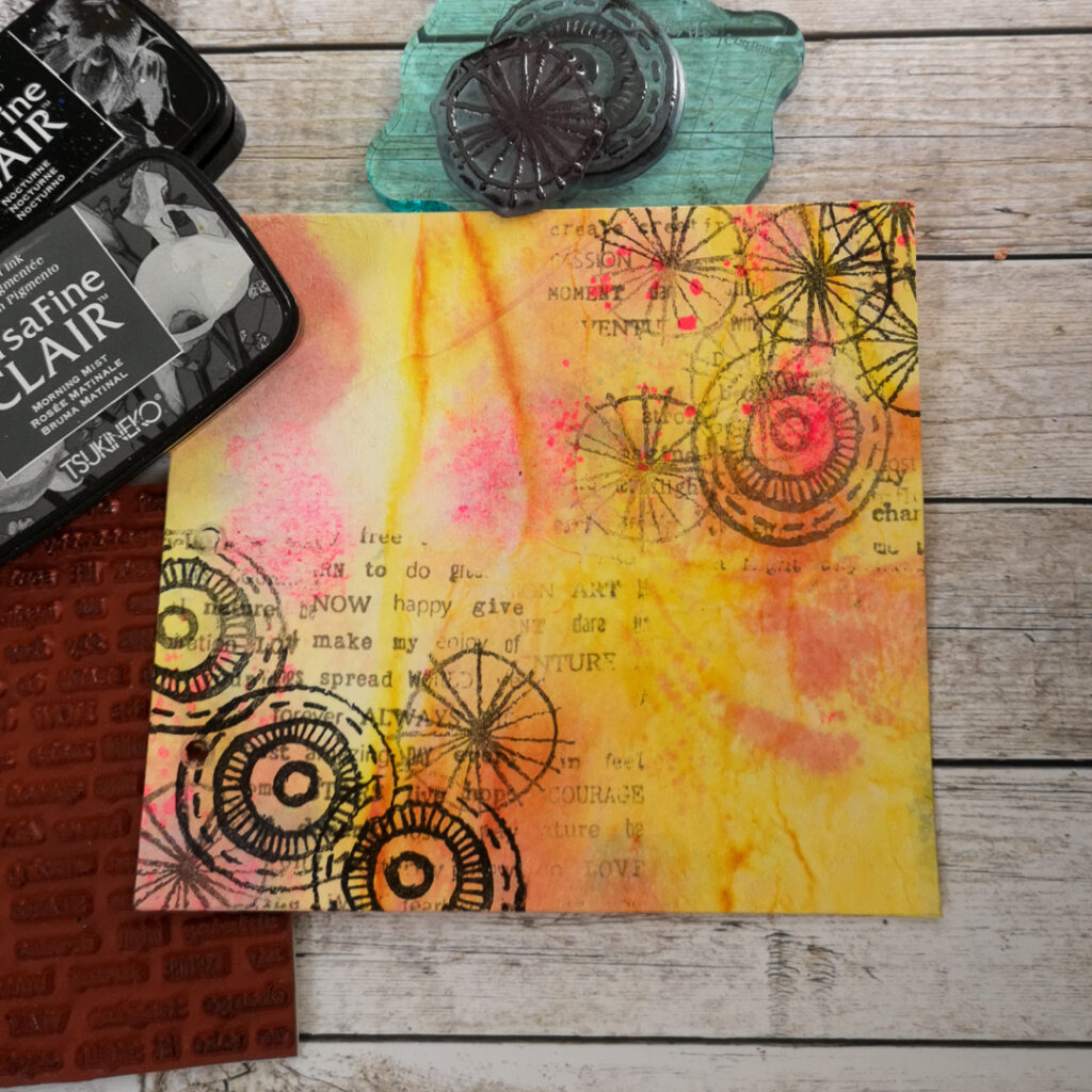 Today I chose one of my wallpapers and pasted it over the Art Journal page. Then I stamped in two opposite corners, first with Mix a Sentiment 1 irregularly with gray ink and then on top, with Pencil Marks 5 in black ink.