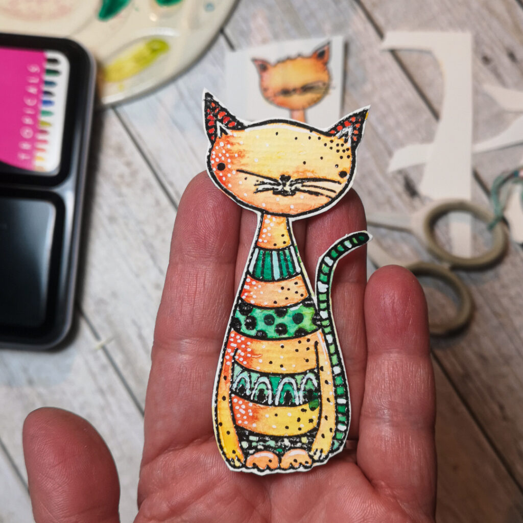 I stamped them on watercolor paper and colored them with my Tropicals watercolors. Then, as always, I added my style with Black and White acrylic markers. Finally, I chose this cute little cat.