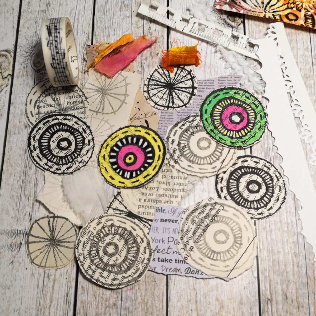I stamped the two round stamps of the set Pencil Marks 5 over book sheets and fuzzy cut them.