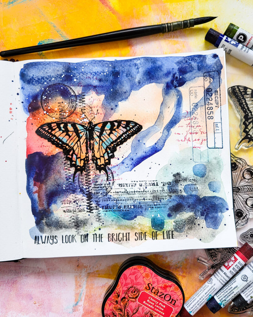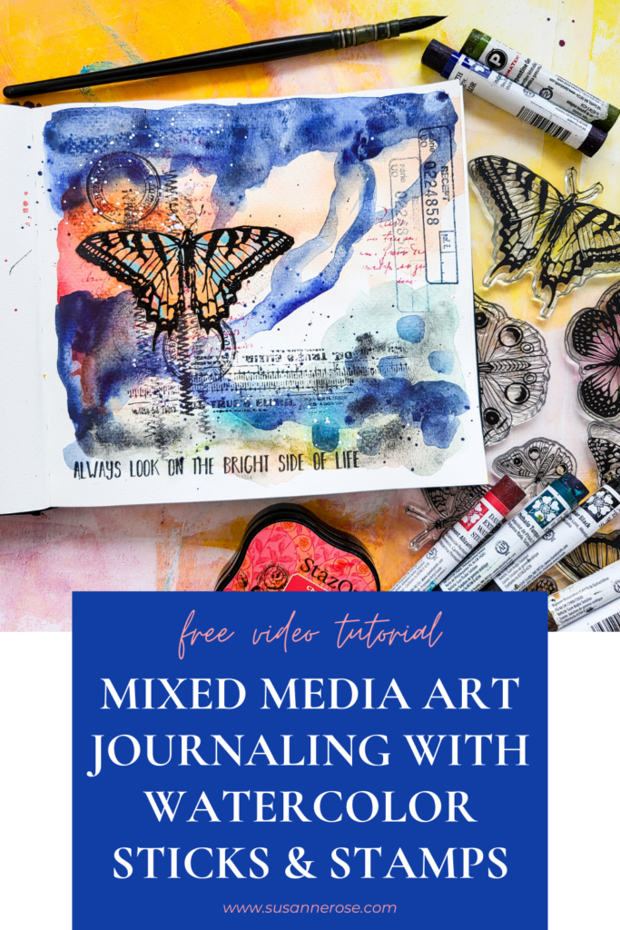 Hi there, Susanne here with an art journaling tutorial. Today I’m playing with my Daniel Smith watercolor sticks and stamps from Butterflies and Moths, Mix It Up 6 and Mix It Up 5. I really love playing intuitively and abstract with watercolors. You don’t need these sticks to play along, usual watercolors will work just as fine.