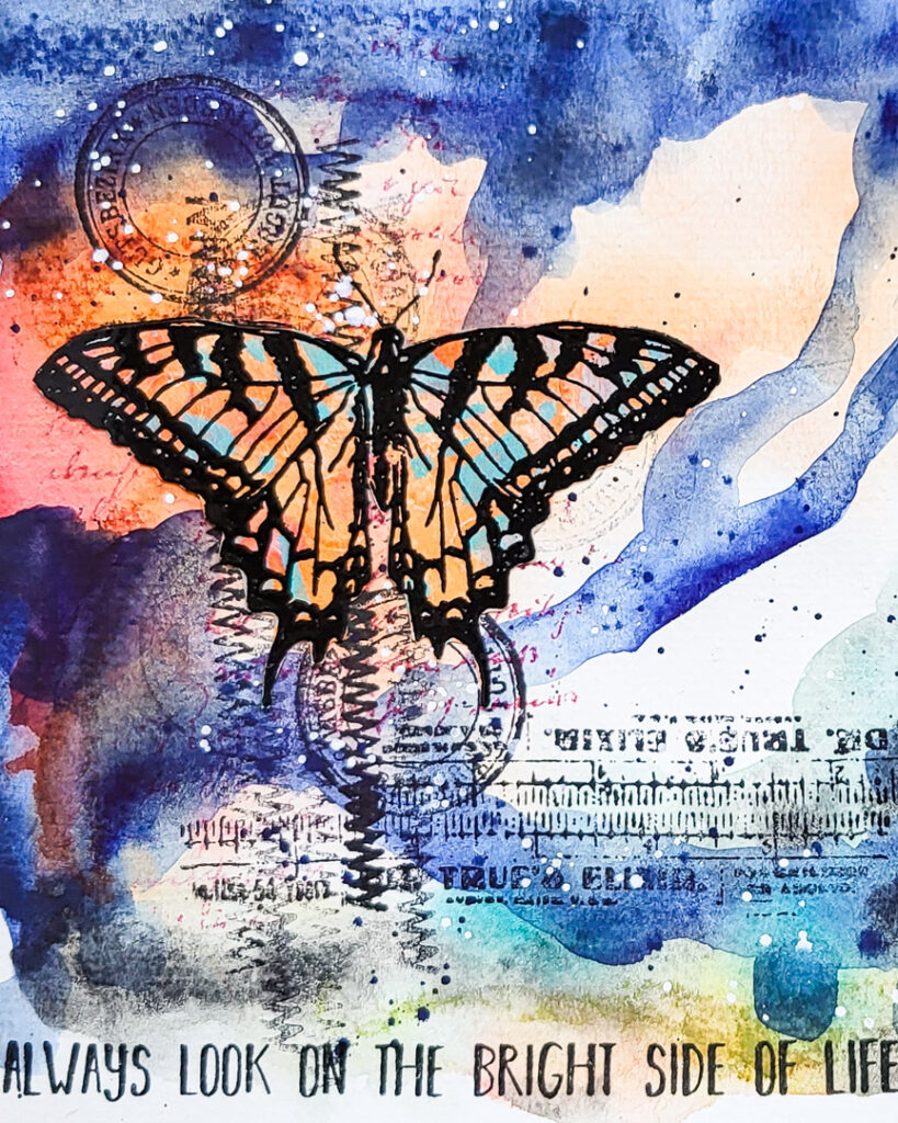 My focal image is one of our Butterflies and Moths stamps. I embossed it in black onto a gelli print, that had some matching colours for the background. The sentiment is from an older set, which is no longer available. I finished the page with some white splatters.