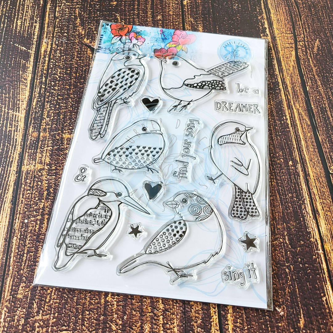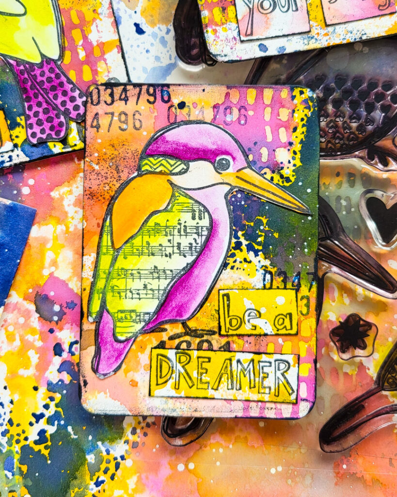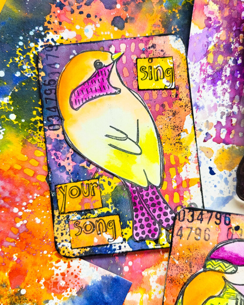 I stamped my birds to a piece of mixed media paper and also directly to the cards. I cut the ones out of the mixed media paper, directly on the black outline and adhered them into the images on my ATCs. With this method I am able to cut away the feet.