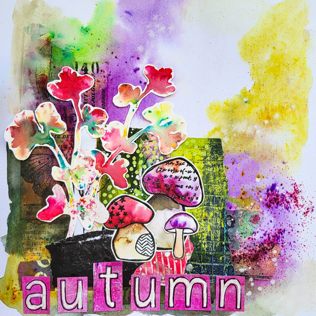 Hi there, Susanne here with some autumnal inspiration using some collage fodder embellishments, that I’ve made with our new Textured Mushrooms 2 stamp set and leaves made with Sketchy Leaves 4! For the background I used some handmade Washi Tape and Brusho powders.