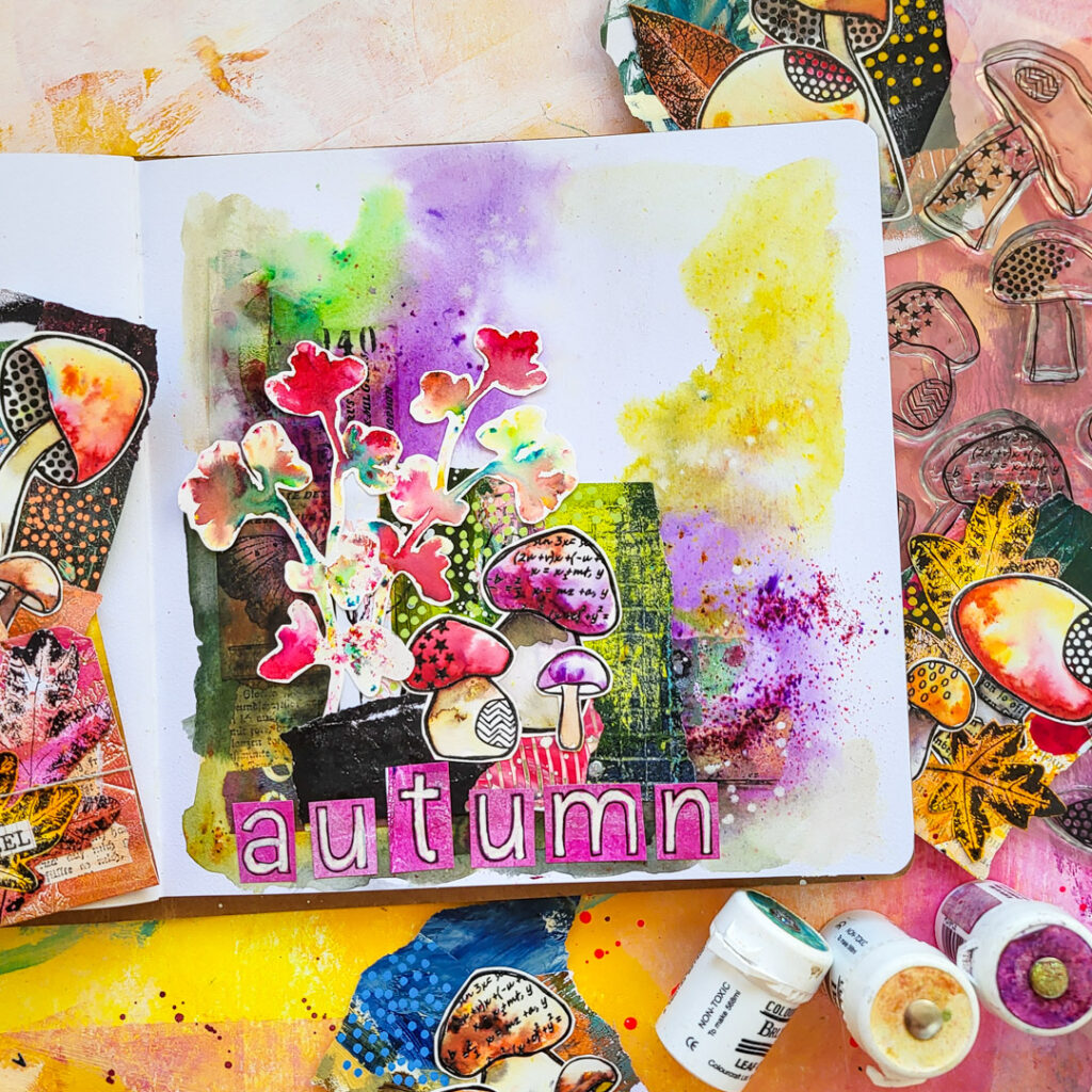 For the focal images I am using some of my handmade collage fodder embellishments with our Textured Mushrooms 2 and two leaves made with our Sketchy Leaves 4 stencil and Brushos. (here is described how these are done). A video on the ephemera pieces is linked at the end of this post! I am finishing the page by creating a sentiment with our A to Z stamps. I stamped them to some pink paper, cut them out, adhered them and painted them with an ivory posca pen.