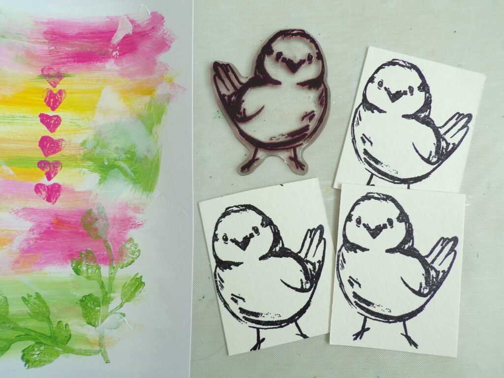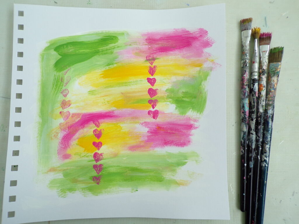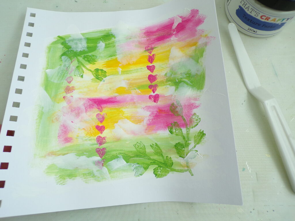 I created the background using white gesso, just three colours and the hearts stamp from the Mix It Up 3 stamp set.