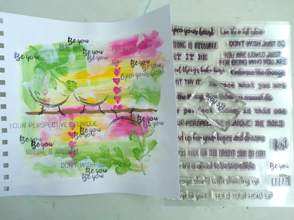 To arrange my page and to get the birds and their legs in the right place I stamped the bird on to my page, (they’re standing on a twig I painted with brown paint), doing this also let me plan more of the background and where I would stamp words from the Mixed Sentiments 1 stamp set.