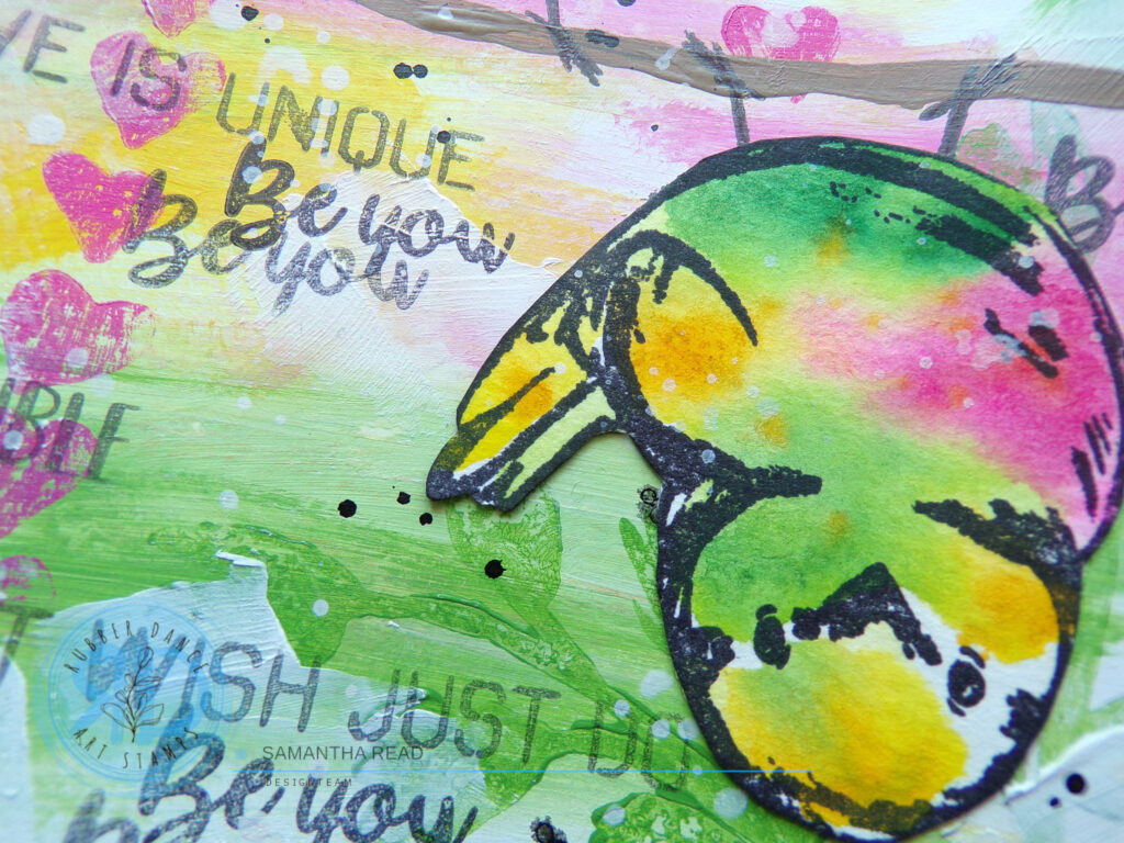 Hello, Samantha here today and I’m sharing a tutorial showing how I made another page ready for my art journal. I am creating a layerd mixed media background. My focal images is one of the cute Sketchy Birds 2. This was a joyful page to create with great colours and an upside down bird!