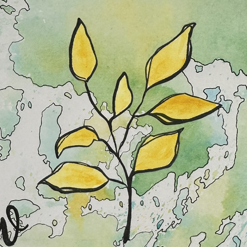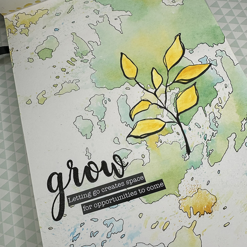 I have outlined some of the splashes with a black pen. The leaves on the stamp are coloured using water colour paint. The page was completed with a sentiment.
