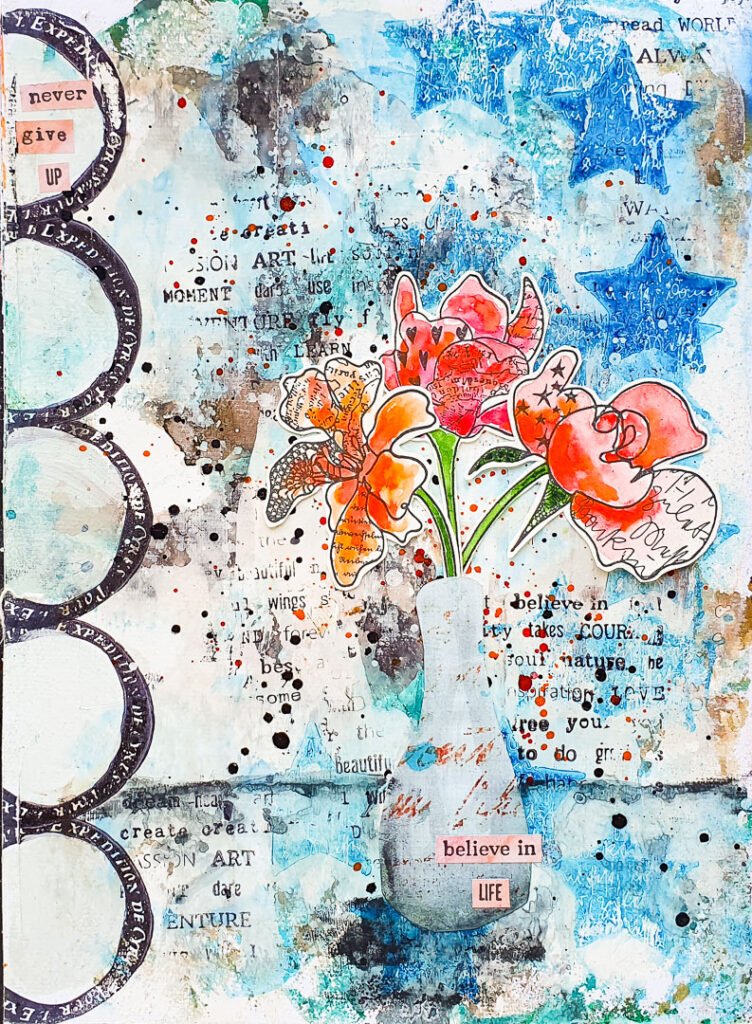 Hi there, Susanne here today with some quick inspiration for your art journal. I made this spread in my Dina Wakley mixed media journal using some of our Doodle Flowers as my focal images. For the background I used stamps from Mix It Up 2 and the Mix A Sentiment 1. As a contrasting object I used the circle from Mix It Up 1 to create a border.