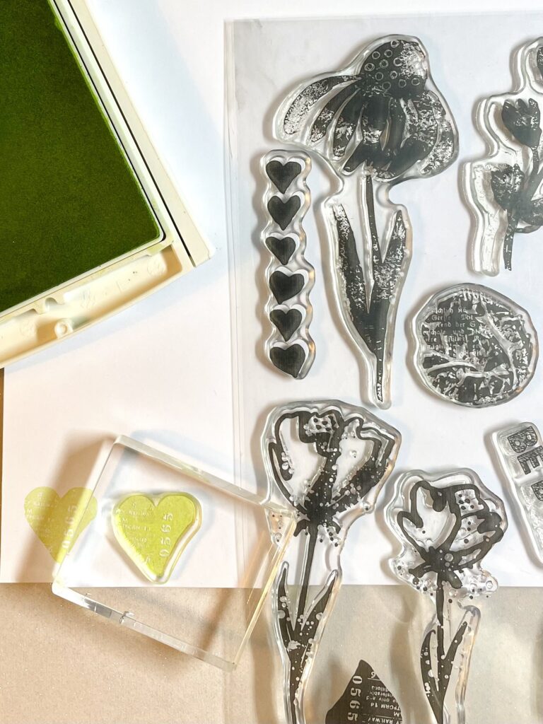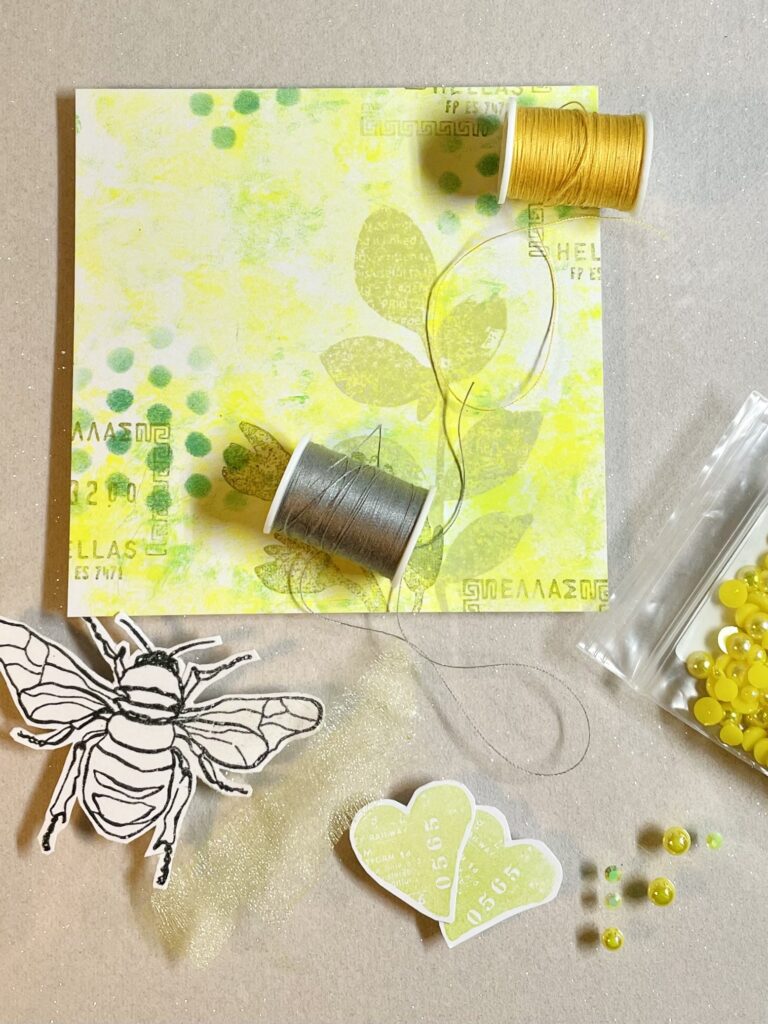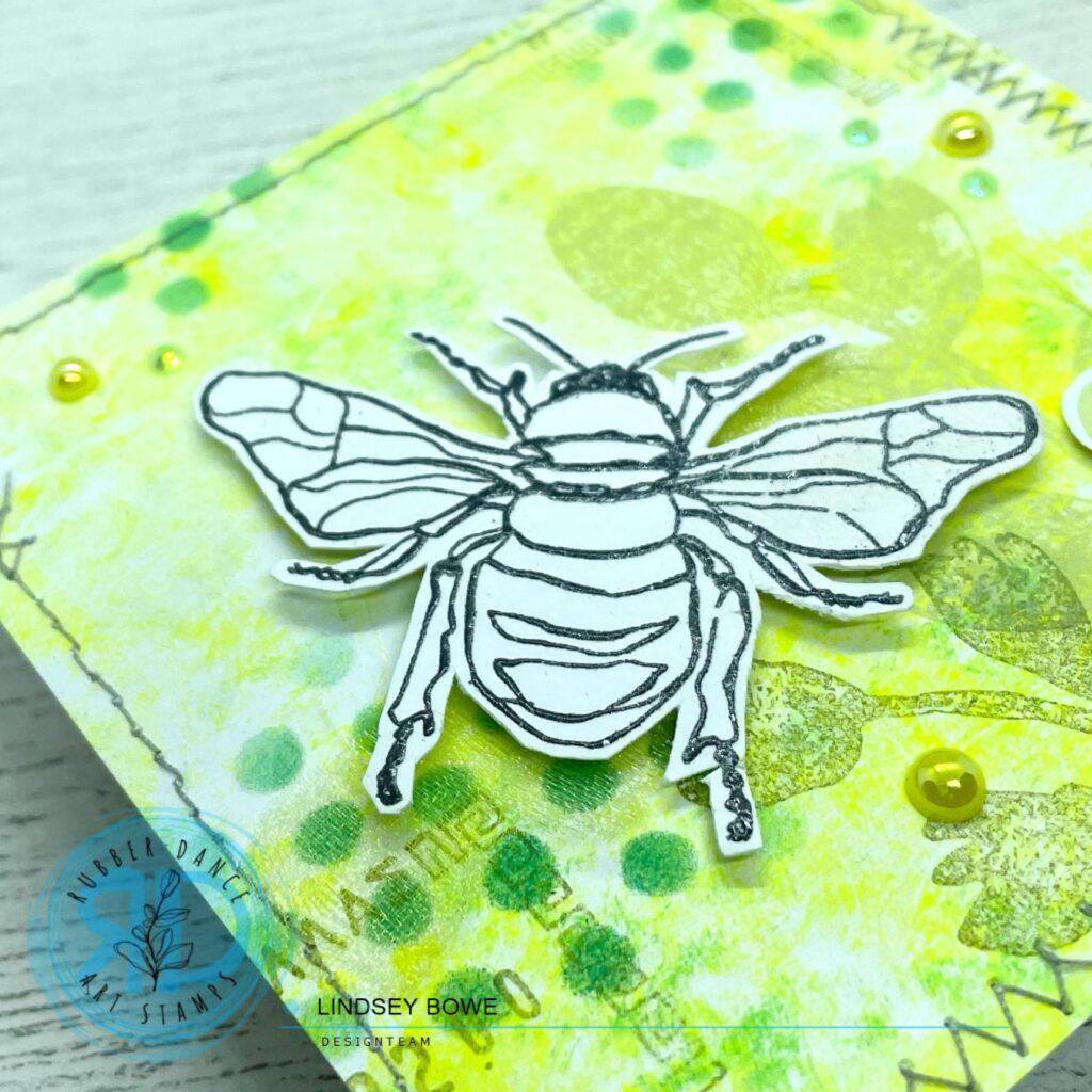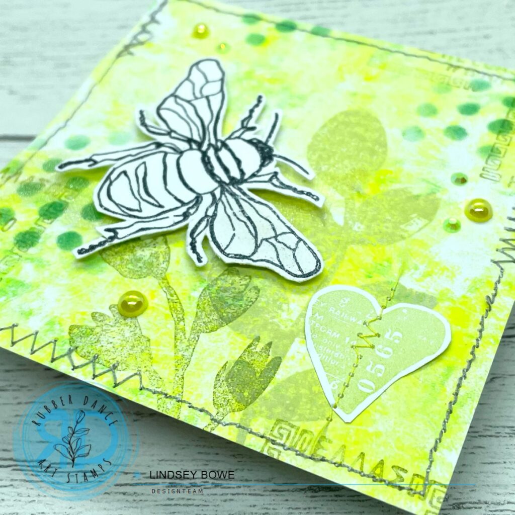 Lindsey (@doodlings_cards) with you today. I have a mixed media project using the lovely bee from the Inky Friends stamp set. I used a Gelli print from my stash, and added lots of layers with Rubber Dance’s fab background stamps and stencils😊 and Distress Oxide inks.